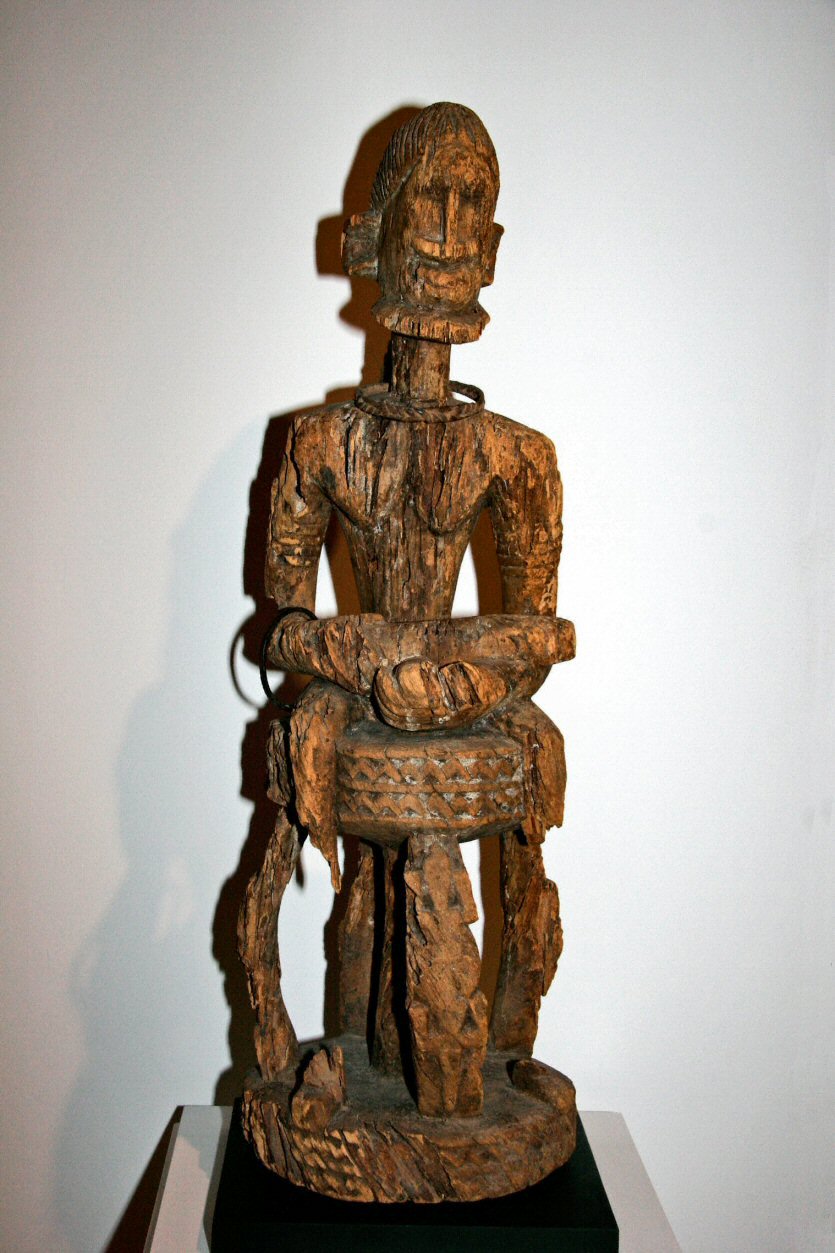 | Seated Hogon Figure, 34" Dogon, Mali This diviner priest is seated on a stool composed of circular disks connected by upright supports, alternately carved to include images of turtles and crocodiles, liminal creatures that inhabit two worlds, as does the diviner. Incised zig-zag patterning on the top ring of the stool refers to the serpentine path of Lebe, primordial ancestor and protector of the Hogon. (Griaule: Conversations with Ogotemmeli) The object across the lap of the figure may be a musical instrument, a metaphor for harmony. This seated figure is comparable to a smaller example in the Rockefeller Collection at the Metropolitan Museum of Art in New York which holds a calabash and striking stick. |