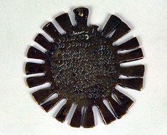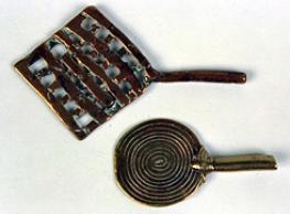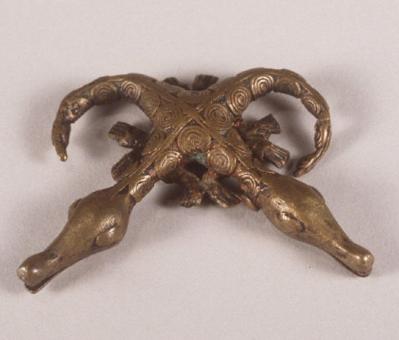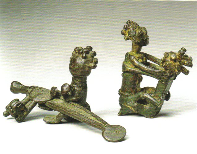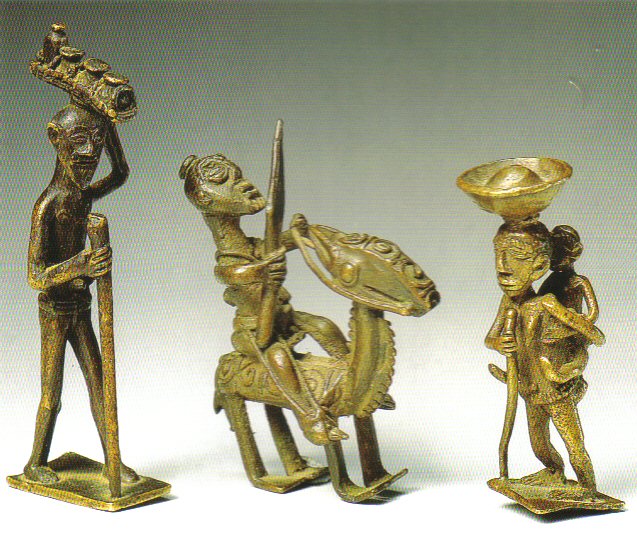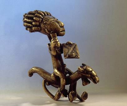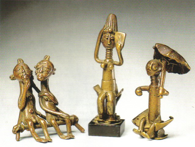 | Asante goldweights Gold was a principal source of wealth and status for Asante. The Asantehene and his court officials were traditionally bedecked with a profusion of gold ornaments and insignia of office. Cast gold ornaments were made by highly skilled craftsmen answerable directly to the Asantehene, who could veto their manufacture for persons who were not entitled to them. Gold dust was used as currency for trade and payment of fines. It was weighed on special scales with bronze weights, many of these in figurative form made by the lost wax technique. Goldweights, called mrammuo, provide great insight into the art, bronze casting tradition, and economic trade history of Africa. Beginning in the late 1300s, gold that was mined in southern Ghana began to be traded northward. Gold was traded from southern Ghana to the African Sahel and then across the Sahara desert. The Akan people began producing goldweights that corresponded to the weights and measurements of their trading partners. For instance, the Akan goldweights were based on an Islamic and Sahelian ounce. This production of various gold weights used to compare with the standards of fellow traders continued as the Akan peoples traded with the Portuguese after 1470 and the Dutch after 1600. From circa 1400 to 1900, goldweights were used by the Akan and Akan-related peoples of southern Ghana and regions of the Côte d'Ivoire to weigh gold dust. The variety of goldweight types derives from both artistic creativity and the history of gold trading. The great variety of weights grew from necessity and their forms demonstrate surface decoration, organic, abstract, and geometric forms and symbolism. Complete sets of gold weights are an indication of status. Wealthy and powerful people tend to have larger and more ornate sets of goldweights than others. When a young man is eligible for marriage, his father usually provides him with a small set of goldweights as a necessary tool to earn his livelihood. In fact, a goldweight collection is related to one's soul and sometimes included in religious ceremonies for purification. Source: http://www.muhlenberg.edu/cultural/gallery/african/goldwts.html Asante Kuduo containers Kuduo were created to store valuable possessions such as gold dust, and served the symbolic purpose of safeguarding their owners' kra, or life force. They played an important role in ceremonies intended to maintain the spiritual well-being of those who owned them. At life's end, kuduo were left at their owners' burial sites along with other personal possessions. If the kuduo belonged to a paramount chief, it would accompany his ceremonially blackened stool in a special room devoted to his spirit and memory. The latch mechanism typically displayed on the sides of such vessels refer to their role in retaining and protecting the souls of their owners. |