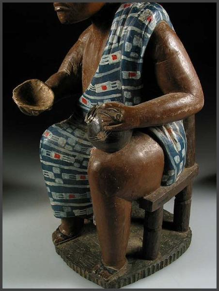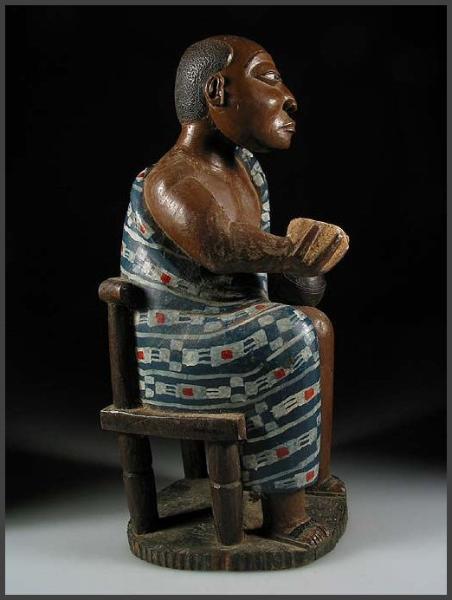 A wonderful Ashanti male figure sitting in a chair holding a bowl in one hand and a container in the other hand. Beautiful form in the carving and great detail. Aprox 15.75" tall Acquired from and photos by: Roman Herzog |