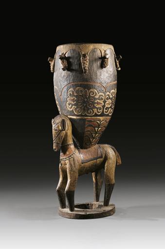 | Sotheby's - Paris Art Africain et Océanien, African and Oceanic Sale Auction Date : Dec 5, 2003 Lot 83 : SUPERBE TAMBOUR À CARYATIDE, BAGA, GUINÉE Description DETAILED DESCRIPTION Grand tambour timba à membrane, au décor très élaboré dont le corps, vaste et profond, est supporté par un cheval caryatide. Outre sa taille spectaculaire, ce tambour se caractérise par la très grande élégance qui s'en dégage. L'ensemble, constitué par la base ronde, le cheval à la silhouette stylisée et le corps du tambour présente une parfaite harmonie, donnée par l'élancement des formes et la souplesse de la ligne. Très beau décor de la surface, à motifs stylisés - géométriques ou naturels - sculptés en bas relief. Une couche de kaolin recouvre l'ensemble de la sculpture et sert de base au décor polychrome. Le bord de la membrane a conservé ses poils d'origine. Bois polychrome, peau et fibres. Très bon état général de conservation. Condition Ancienne cassure du socle avec réparation indigène; longue fente sur le flanc gauche du cheval et une étroite à l'arrière du corps du tambour; petits éclats de peinture; petit trou de 3 cm de long dans la membrane encore parfaitement tendue. Dimensions haut. 138 cm, long. 65 cm, larg. 60 cm Estimate: € 35,000 - € 50,000 Price Realized: $ 42,922 € 35,625 Provenance LOT 83 PROVENANT D'UNE COLLECTION PRIVÉE EUROPÉENNE Collecté en Afrique de l'Ouest par Rolf de Maré avant 1938 et donné au propriétaire actuel en 1964. Collected in West Africa by Rolf de Maré prior to 1938 and given to the present owner in 1964. Notes This drum compares most closely in relation to the horse caryatid and the overall refinement of carving to another well-known timba in the collection of the musée du quai Branly, Paris, number 65-1-12 (see Lamp 1996: 183, no. 172 and MAAO 1999: 54). This magnificently conceived drum was used exclusively by adult Baga males of high ritual standing, primarily in male initiation ceremonies called kä-bërë- Tshol or 'entering the medicine', before such ceremonies ceased with the Islamization of the Baga people in the 1950's. The male drum is called timba, as opposed to the female Baga drums, called a-ndëf, used for female initiation ceremonies. The use of the timba was restricted to men of the secret Simo society. It was a tool that underscored the primacy of male social institutions and their political power in an adult world. For men, indeed, the main ritual occupation was the control of initiation into adulthood, immersion in esoteric knowledge of the sacred, and the use of restricted paraphernalia. Primarily used in initiation ceremonies, the timba could also be played at weddings, funerals of high- ranking male elders and sacrifices to the ancestors, especially after the harvest. According to Lamp, horse figures appeared in two types of traditional Baga works: the timba drum and the stool. 'The use of the horse in the sculpture of the patriarchy is a symbol of Baga adaptation to changing political conditions at the highest ritual level. The Baga of the twentieth century were introduced to the horse with the coming of the mounted French commandant.' Overlaid with existing symbolism known to the Baga, the horse was ultimately a symbol of power and invincibilty. Its incorporation into timba drums - the most visible and enduring symbol of the patriarchy - further showed that the elders were capable of appropriating new symbols of power (Lamp ibid.: 202-203).  |