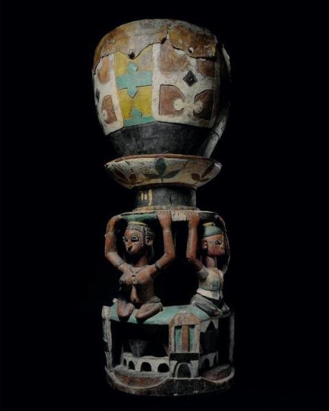 | Sotheby's - New York African & Oceanic Art Auction Date : Nov 11, 2005 Lot 32 : A RARE AND MAGNIFICENT BAGA MALE DRUM Description PROPERTY FROM THE JEFFREY SWANSON COLLECTION measurements note height 65 1/2 in. 160cm; diameter of the drum 24in. 61cm timba, of large proportions and carved in four tiers from a single piece of wood, the circular base supporting an openwork, geometric architectural structure, beneath four elaborately carved alternating male and female seated caryatid figures, the females wearing a cache-sexe, armbands and a necklace, the males wearing colonial dress, each with hands raised and supporting the disc-like base of the drum, the drum with a hide tympanum secured with pegs at the edges, of hollowed tapering form and carved in low relief at the perimeter in alternating squares of two-part and four-part motifs above a saucer-like support with foliate designs and a waisted base; fine layered and aged surface in black, white, green, red and yellow pigment. EXHIBITED Baltimore, Maryland, The Baltimore Museum of Art, Temporary Loan Exhibition, 1997-2000 LITERATURE Lamp, Art of the Baga: A Drama of Cultural Reinvention, 1996: 189, figure 181 catalogue of the exhibition, The Museum for African Art, New York, October 4, 1996-January 5, 1997 (see bibliography for additional venues) Binkley, De Carbo, Kraemer, Making the Grade: African Arts of Initiation, 2001: figure 3 catalogue for the exhibition, Washington, D.C., The National Museum of African Art, Smithsonian Institution, November 11, 2001-October 27, 2002 The National Museum of African Art, Smithsonian Institution, brochure cover, January, February, March, 2002 NOTE This magnificently conceived drum was used exclusively by adult Baga males of high ritual standing, primarily in male initiation ceremonies called kä-bërë-Tshol or 'entering the medicine'. We can suggest a date of carving in the late 19th century or early 20th century as the kä-bërë-Tshol ceased to exist amongst the Baga before 1950 as a result of conversion to Islam. The male drum is called timba, while its female counterpart is known as a-ndëf, used exclusively for female initiation ceremonies (see Sothebys, New York, November 29, 1984, lot 167 for a related drum depicting two female figures). The use of the timba was restricted to men. Beliefs about the drum operated on a number of levels: the drum was a tool that underscored the primacy of male social institutions and their political power in an adult world. For Baga men, indeed, the main ritual occupation was the control of initiation into adulthood, immersion in esoteric knowledge of the sacred, and the use of restricted paraphernalia. While the timba was primarily used in initiation ceremonies, it also made appearances at weddings, funerals of high-ranking male elders and sacrifices to the ancestors, especially after the harvest. In these contexts, the power of men was asserted through the appearance of the drum. The drums were so tall that they could be played only by standing on a stool (see Lamp 1996:119 for a photograph illustrating this use). Visually, the iconography of the timba, according to Lamp (1996:120), contributed to the aura of authority that the adult men constructed. The standard form of timba drums is a hollowed barrel atop a figurative substructure. The caryatid took the form of a Nimba headdress, horses and other animals, birds or abstract designs. On the Swanson drum the artist has carved figures in colonial dress and indigenous dress. The figures encircle an architectural scene reminiscent of early colonnaded ecclesiastical buildings erected by the French in Guinea in the 19th century. Compare the architectural model on the Swanson drum with the form of The Résidence Episcopal, Les Pères du Saint-Esprit, Conakry, one the first two story buildings in Conakry erected by the Catholic Church (Lamp 1996: 188, figure 180). This building, and indeed the repetition of the form on the drum had widespread symbolic impact--surely a commentary on the new spiritual and economic connections the presence of the Catholic church and the French brought to this area of Guinea at the end of the 19th century. A drum was one of the most important commissions an artist could receive in Baga society. The layering of meaning and dynamic carving on the Swanson drum is typical of the considerable bravado and creativity on the large drums. The Swanson drum, carved from a single piece of wood, is clearly the work of a master carver in its bold proportions and fully three-dimensional execution. Fred Lamp (personal correspondence) knows of only 13 large timba drums in existence, and only one other in a private collection. See for comparison, Lamp (1996: 182, figure 172) for a non-figurative drum in the collection of the Musée des Arts d'Afrique et d'Oceanie, Paris; ibid. (119, figures 92 and 93) for another in the collection of the Royal Ontario Museum, Toronto and another being played in situ in Katako village from a photo circa 1930. See also Schmalenbach (1988: 100, figure 37) for a figurative drum in the collection of the Barbier-Mueller Museum, Geneva. According to Lamp (personal communication June 18, 1997) the most closely related drum, with respect to the figurative quality of the drum, is another in the collection of the Rautenstrauch-Joest Museum, Cologne. Estimate:$ 150,000 - $ 250,000 Price Realized:$ 180,000  |