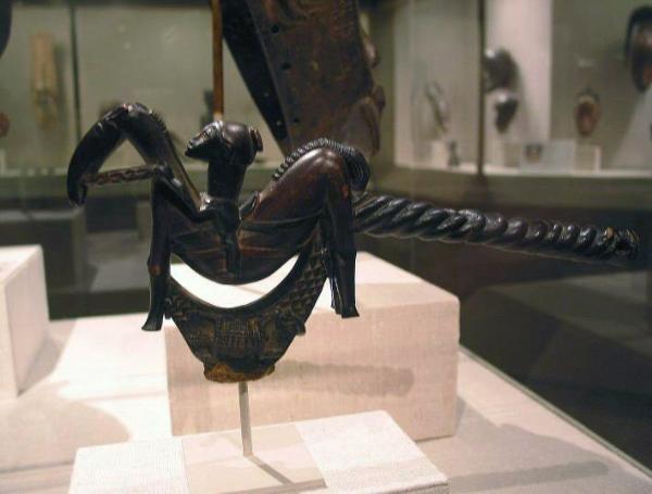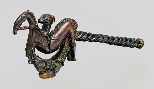 | The object above is in the collection of the Metropolitan Museum of Art, NY Gong Striker: Equestrian (Lawle) Baule, Côte d'Ivoire Wood, cloth; 10.8 x 25.1 cm (4 1/2 x 9 7/8 in.) 19th–20th century The Metropolitan Museum of Art, New York, Purchase, Pace Editions Inc., Fred and Rita Richman, and Mr. and Mrs. Milton F. Rosenthal Gifts, 1977 1977.335 "A dramatic spectacle enhanced by dance and music provides the arena for revelations made by Baule trance diviners (komien). The sound of a gong hit with a finely carved gong striker, such as this example, acts as a catalyst that triggers the state of awareness necessary for komien to serve as mediums. This work was originally designed to be struck against a bell-shaped iron gong by the diviner in the privacy of his or her shrine room before initiating a public session. The percussive ring induces trance and possession by nature spirits (asye usu), and if the diviner senses their departure at any point before the event's conclusion, it is struck again. Within the context of the consultation witnessed by the community, the beauty of this carefully carved implement contributes to the aesthetic appeal of the dramatic spectacle, which is choreographed to combine costumes, dance, and music with a display of various sculptural forms owned by the diviner.1 These add to the theatrical appeal of the event and denote the diviner's professional stature. There are two distinct types of gong strikers: kokowa, utilitarian strikers devoid of embellishment, and lawle, intricately carved implements that display their maker's deliberate aesthetic intentions.2 In these more elaborate works, the repertory of motifs joined to the handle includes female figures, zoomorphic imagery, and bo nun amuin masks (men's sacred masks kept in bush sanctuaries where women are forbidden to enter). Although the maker of the example shown here would not have seen the equestrian subject it depicts, the design of this lawle ranks among the most accomplished of its genre. The overall conception of the expressionistic horse fuses together a swayback and a long camel-like muzzle with the carefully rendered minutiae of the carved reins. The scale of the rider's upper body contrasts sharply with that of his legs. Below, the broad concave curve of the horse's stomach is emphasized by the crescent-shaped negative space between it and the concave curve of the finely carved base. The delicate imagery featured in the base both distinguishes its two sides from each other and unifies them. A turtle is the principal protagonist on one side, and a serpent that dominates the other reaches over to bite its foot. This bilateral asymmetry is an intentional aesthetic device used by the Baule makers of such works to create contrast as well as to surprise and to demonstrate their inexhaustible invention.3 At the base, a small pad of woven cloth is attached to the striker's hammering element.4 The top of the base, decorated with a carved openwork figurative passage, is joined at a slight angle to the handle, which has been rendered in a classic ropelike form. Baule sculptor Lela Kouakou has noted that this design element is recognized as a mark of an artist's virtuoso talent.5" 1. Baule 1997, p. 237. 2. Perspectives 1987, p. 147. 3. Baule 1997, p. 29. 4. Ibid., p. 221. 5. Perspectives 1987, p. 152. Source |