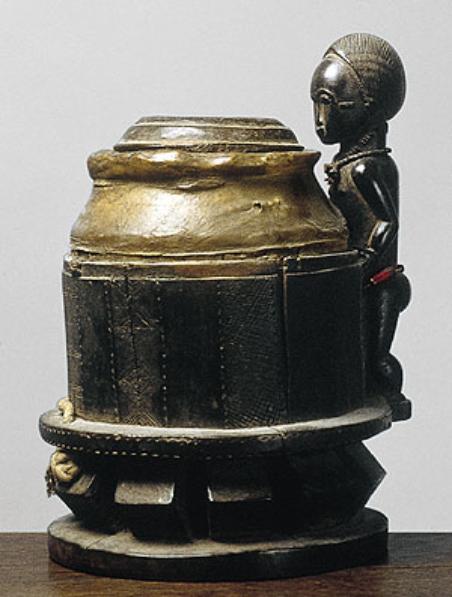 | This mouse oracle was first analyzed in 1935 by Carl Kjersmeier. Its overall design is that of a plain, lidded container resting on a base that takes the form of a Baule woman's circular stool. A single male figure holds on to the upper edge and stands with his feet balanced on the ledge that encircles the bottom of the container. The harmonious design of the body emphasizes a succession of rounded forms: elegant head, strong torso, buttocks, and calves. The finely carved details of the figure's features contrast sharply with the vessel's lack of surface articulation. These include the elegantly textured coiffure, and cicatrization markings on the temples and neck, enhanced by beaded strands around the neck and hips. In its position attendant upon this oracular device designed to reveal knowledge, the figure appears to be either its muse or a suppliant. Metropolital Museum of Art |