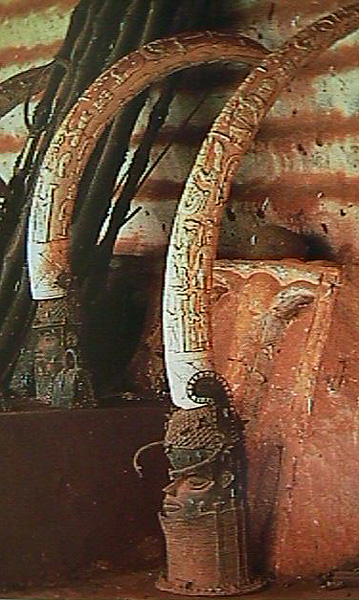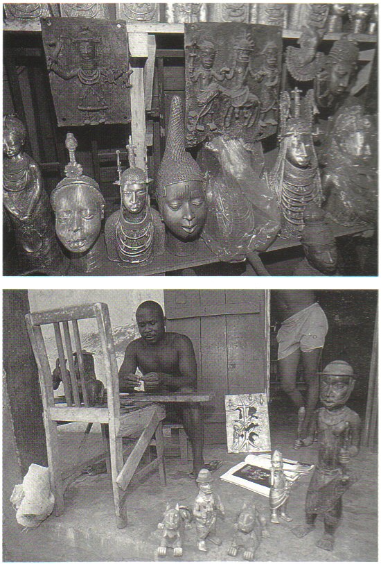 | Top photo: Interior of a shop filled with contemporary brasscastings. Brasscasters quarter, Igun Street, Benin City, 1995. Photo: Joseph Nevadomsky. Bottom photo: Copying from art books, artists from Igun Street create and artificially patinate reproductions of pre-1897 objects. Benin City, 1995. Photo: JosephNevadomsky. CLICK HERE to go to an article called: Art and science in Benin bronzes African Arts, Spring, 2004 by Joseph Nevadomsky It's an interesting article on the "issues" of Benin bronze objects |