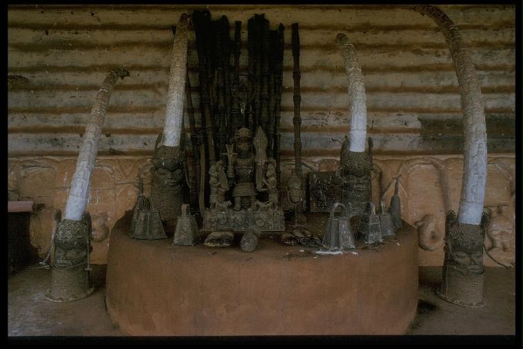 | Altars dedicated to past lyobas, or queen mothers, like those of past Obas, are furnished with cast brass commemorative heads. These altars are found in the lyoba's palace at Uselu and in the Oba's own palace. Like the altars to the king, the queen mother's altars also contain bells, rattle-staffs, and other types of sculpture, such as altar tableaus and cast brass roosters. The title of queen mother was introduced by the early-sixteenth-century Oba Esigie to honor his mother, Idia, for her help in averting two serious threats to his rule and the integrity of the kingdom (Ben-Amos 1980:24; Nevadomsky 1986:44). Like Idia, the queen mothers are known for their ability to bring their own supernatural powers to the aid of their sons. Queen mother heads are distinguished by a special type of coral-bead crown with a high, forward-pointing peak, an elongated version of an elaborate coiffure known as "chicken's beak," worn by high-ranking Edo women (fig. 19; Ben-Amos 1980: fig. 25). The projection on the queen mother's crown is called ede lyoba, akening it to the spiritually potent ede projection on top of the Oba's crown (Blackmun 1991:60). The right to wear a coral-bead crown is limited to the Oba, the queen mother, and the Ezomo, the Oba's principal war chief, and thus conveys the queen mother's importance in the Benin political hierarchy. An Oba has many wives, and the Qrst one who gives birth to a son, who will succeed his father, will eventually become the lyoba. She is granted the title several years after her son is crowned. Oba Erediauwa has recently named his mother, Aghahowa N'Ovbi Erua, as queen mother; she is the first to hold the title since 1897. The lyoba advises the Oba and is the only woman considered one of the senior Town Chiefs. Like them she is responsible lor administering a portion of the kingdom for the Oba. In her case, ihis is the former village of Uselu, which is now part of Benin City. The queen mother heads can be divided stylistically into two types (Dark 1975). One group resembles the early types of commemorative heads for kings: they have a tight-fitting bead collar under the chin; the facial features are sensitive and relatively naturalistic; and they are extremely thin-walled, delicate castings (fig. 20; von Luschan 1919: pi. 52). A second group of queen mother heads is closer in style to later Oba heads, Dark's types 4 and 5. As seen in cat. nos. 6, 7, and 8, these heads are large, thick-walled, heavy castings. They have a high cylindrical bead collar that comes up to the mouth. They also have a semicircular opening at the top to enable them to support an ivory tusk, probably on a wooden peg placed inside the head. In addition to the collar and the pointed bead crown with bead clusters on each side, the queen mother is shown wearing a beaded headband, which wraps around her forehead and is tied with a bow in the back, a type worn usually by male chiefs in Benin (see fig. 48). As on the heads of Obas, the lower part of the face balloons outward, and the eyes, inlaid with iron irises, are enlarged in an exaggerated, heavily outlined stare. In cat. nos. 6 and 7 the rims around the eyes are carefully incised with regular, narrowly spaced striatioris. Above eacli eye are four raised ikharo, or gender marks. The flanges around the bases of these heads are less ornate than those on the kings' heads. They are decorated with the looped strap motif, and cat. nos. 7 and 8 also have a single elephant-trunk/hand-with-leaves motif at the front. Like the heads of kings, the queen mother heads are dominated by the sheer quantity and extent of their coral-bead regalia, which frames the face at top, bottom, and sides, alters its natural contours, and gives its human elements an extraordinary aspect. On the basis of their similarity to Dark's type 4 and 5 kings' heads, these queen mother heads are dated to the eighteenth and nineteenth centuries. This seems to have been a period when altars to the queen mothers became more elaborate, as indicated by the quantity of these heads (Dark 1975:88—89) and by the creation of oilier forms of sculpture, such as altar tableaus and roosters, to be placed on the altars. Surprisingly, no objects dedicated to the queen mothers have been attributed to the middle period of Benin art, from the mid-sixteenth through the seventeenth century, although several women held the title during that time. From the fantastic book: Royal Art of Benin - The Perls Collection |