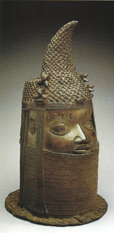 | Head of an Oba (King), 18th century Nigeria; Edo peoples, court of Benin Brass; H. 13 in. (33 cm) Gift of Mr. and Mrs. Klaus G. Perls, 1991 (1991.17.2) Metropolitan Museum of Art The overall cylindrical shape, beaded collar covering the chin, and addition of bead clusters to the crown identify this Benin brass head as belonging to the eighteenth century. The crown, with its pattern of crisscrossed beads with junctures marked by a dot in the center, is characteristic of this period, as are the three raised marks above each eye which are called ikharo, believed to represent scarification marks. Men would usually have three, while women and foreigners would wear four. The pointed oval eyes are outlined with heavy stylized rims, which are not decorated with incisions like those of later examples. Additionally there is no wide-lipped flange at the base of the head, which became an integral component of nineteenth-century heads. |