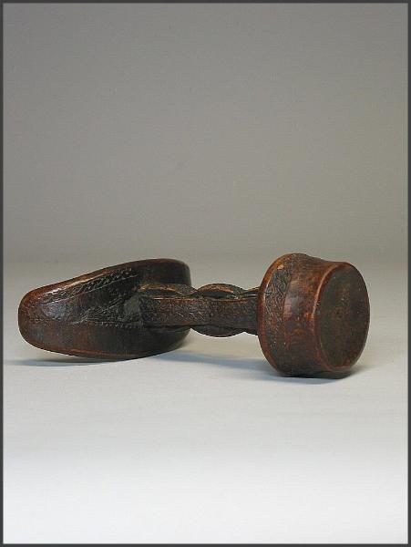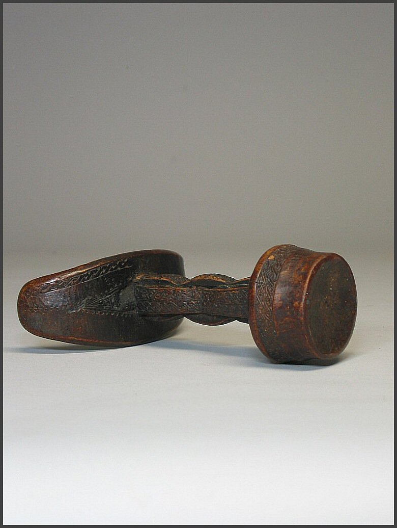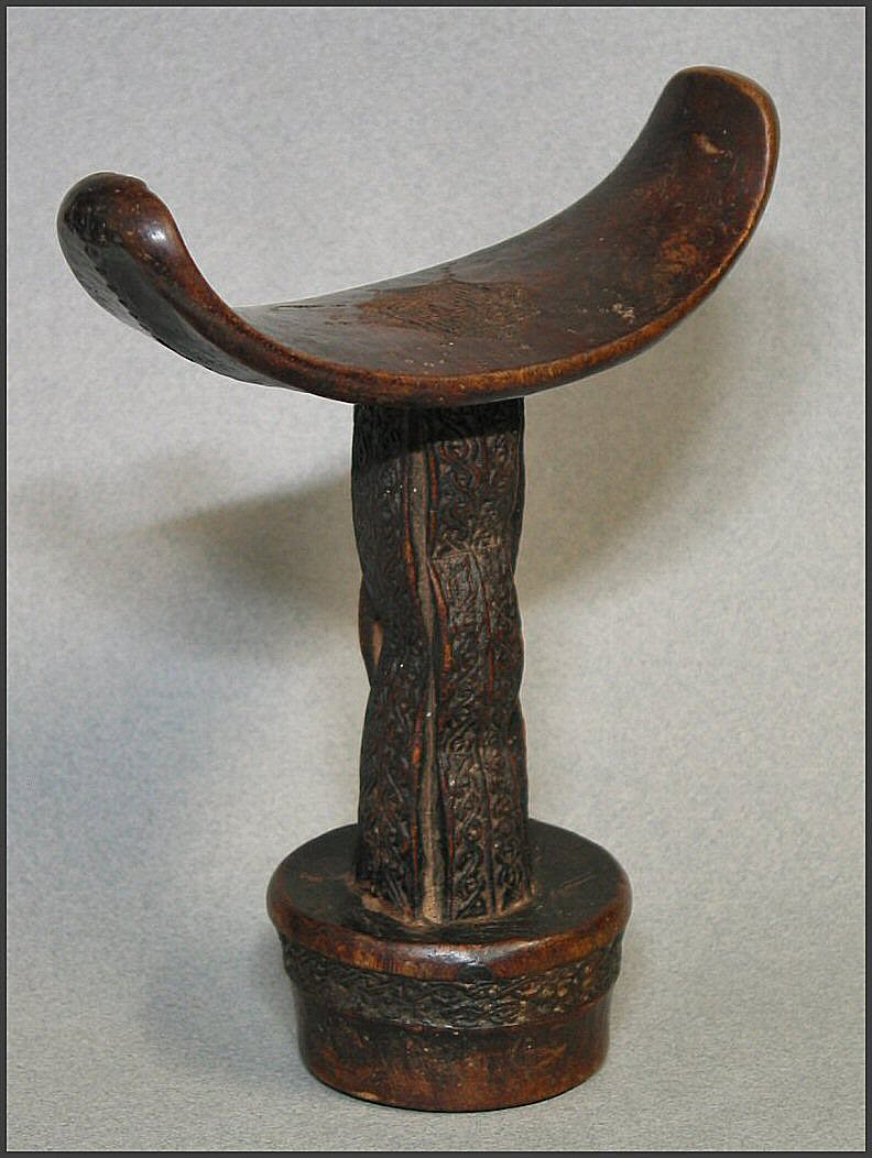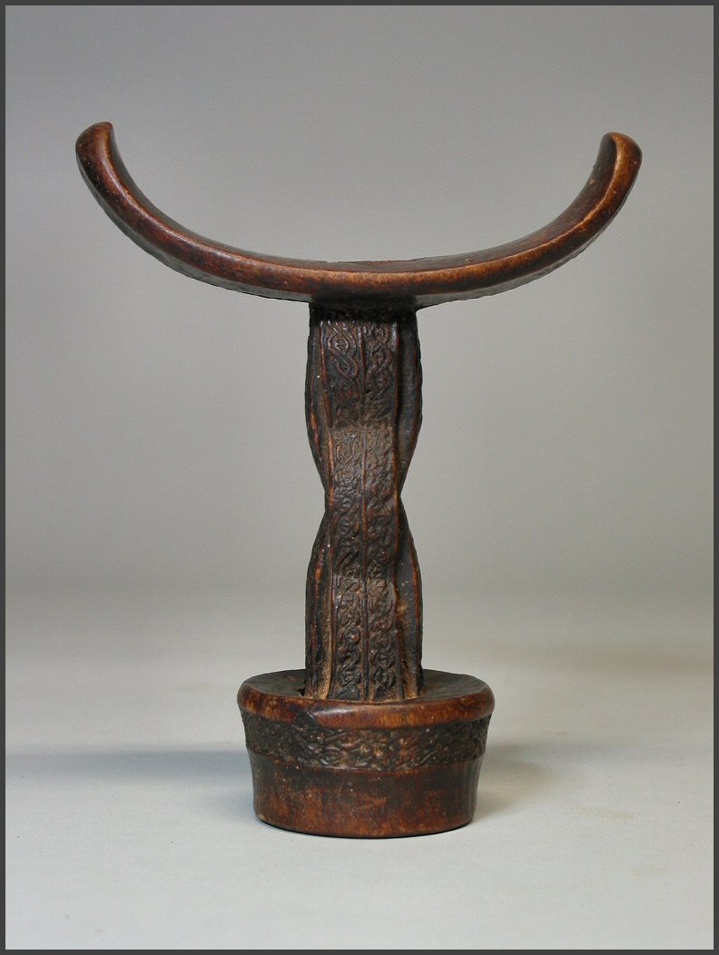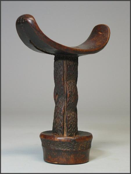 | Headrest, 19th–20th century Somalia; Somali (?) people Wood; H. 6 1/2 in. (16.5 cm) The Michael C. Rockefeller Memorial Collection Bequest of Nelson A. Rockefeller, 1979 (1979.206.31) In the collection of the Metropolitan Museum of Art, NY Subtle, curvilinear forms are combined with intricate, incised patterns in this exquisite headrest from eastern Africa. With a crescent- shaped upper platform, small circular or oval base, and two flattened supporting columns, is this style of headrest is found among the nomadic Somali of both southern Somalia and eastern Kenya. Headrests are used by both Somali men and women while resting or sleeping. It is popularly believed that the headrest serves a protective function by elevating the head off the ground during sleep, thereby preventing any possible attack by snakes or scorpions. Men's headrests, such as this one, generally feature a smaller base that makes them somewhat unstable to sleep on, while the rectangular bases of women's headrests are usually more stable. Scholars suggest that this instability is purposeful as it prevents the user from falling into a deep sleep while guarding the herds at night. It is in this sense that the headrest itself has become a symbol of vigilance among Somali nomads. In this example, the surface decorations of both supports are identical and feature interlaced rope motifs on the top and bottom interrupted by a honeycomb-like relief in the middle. The patterns on this and many other Somali headrests probably reflect the Islamic influence in the region. Some scholars interpret the patterns and iconography as a "form of shorthand for a prayer," to ensure God's protection of the sleeper. Headrests also play an important role in the nuptial ceremonies of Somali nomads. On his wedding night, the groom places the tubash (a sum of money) under the bride's headrest. The morning after the marriage is consummated, the bride will use this money to purchase an amber necklace, the symbol of her new status. The headrests are carved from a single piece of fine-grained wood known as hagar in Somali, or also yucub wood. The wood is usually left its natural color, but is sometimes painted red or black by its owner. Somali nomads also make use of another type of headrest with a single cylindrical supporting column. It appears that the different styles are for men of different status, with the single-columned variety for young men and the double-columned variety, as seen here, reserved for elders. |