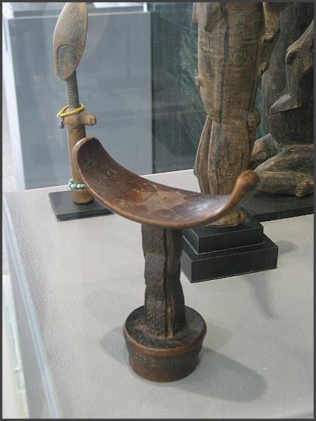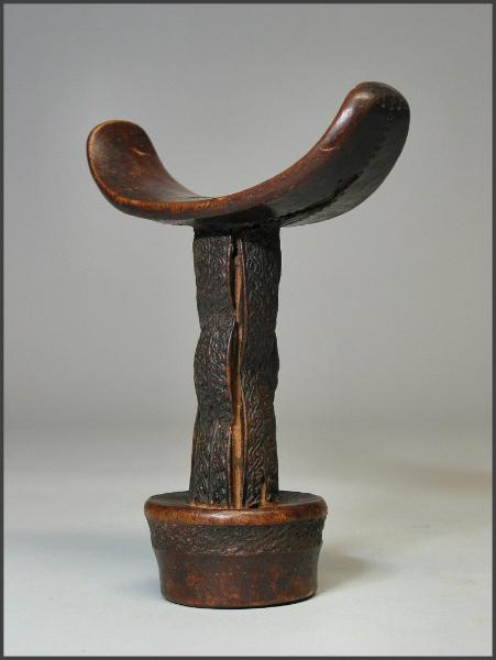 | Headrest (barkin) from the Boni or Somali people of Somalia Men in East Africa use headrests both as pillows and as indicators of status. This type of man's headrest is used by the Boni of northeastern Kenya and southern Somalia and by Somali nomads. Men's headrests generally feature a smaller base that makes them somewhat unstable to sleep on, while the rectangular bases of women's headrests are usually more stable. The small, easily unbalanced base has made the headrest an emblem of alertness and the ability to wake to action. Made of sturdy but relatively light wood, the headrests are used on beds and are carried by herdsmen, who also use them to rest while keeping an eye on their herds. Boni shepherds rest while standing on a single leg, with their head lying on the neckrest set on their shoulder. These neckrests symbolize vigilance because since their base is so small, the resting person could not fall asleep without falling over. The patterns on Somali and Boni headrests probably reflect the Islamic influence in the region. Some scholars interpret the patterns and iconography as a "form of shorthand for a prayer," to ensure God's protection of the sleeper. Headrests also play an important role in the nuptial ceremonies of Somali nomads. On his wedding night, the groom places the tubash (a sum of money) under the bride's headrest. The morning after the marriage is consummated, the bride will use this money to purchase an amber necklace, the symbol of her new status. The headrests are carved from a single piece of fine-grained wood known as hagar in Somali, or also yucub wood. The wood is usually left its natural color, but is sometimes painted red or black by its owner. They may be carved by the owner or commissioned from an artist. Somali and Boni nomads make use of two types of headrests; one with a single cylindrical supporting column and one with a double column. It appears that the different styles are for men of different status, with the single-columned variety for young men and the double-columned variety reserved for elders. The more elaborate the headrest is, the higher the status is of its owner. Boni headrest from Somalia References- National Museum of African Art and Metropolitan Museum of Art |