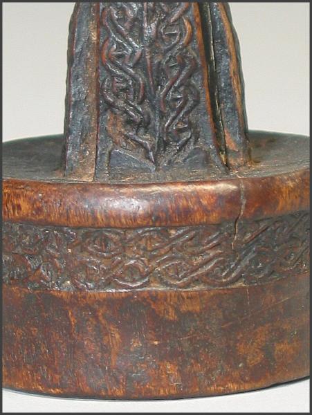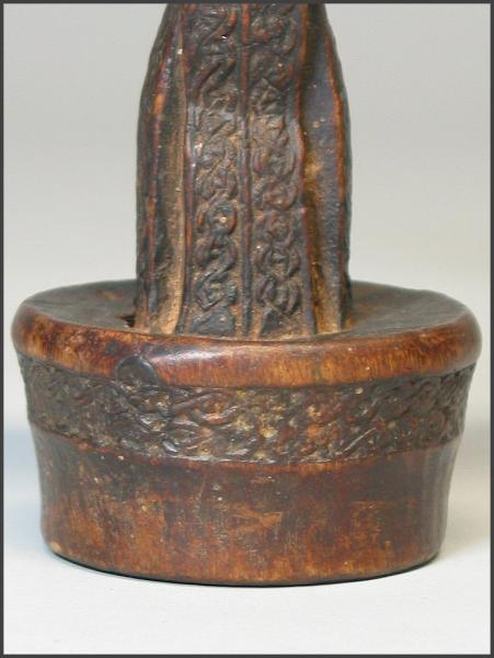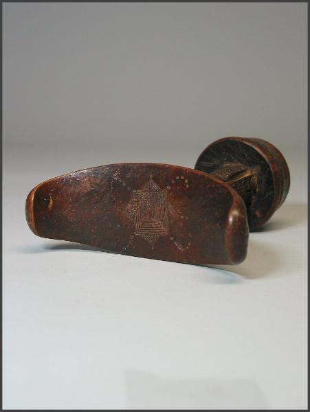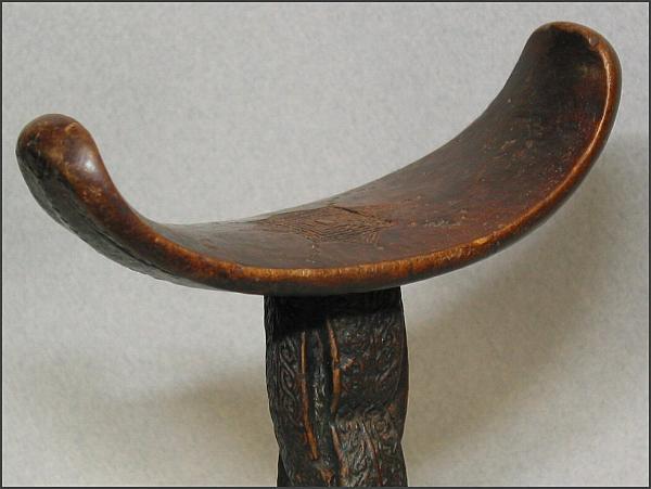 | This headrest has the same stem design as mine does, you just can't see it that well because of the red tassels. Headrest (barkin) Somali peoples Mogadishu, Somalia Late 20th century Wood, plant fiber H x W x D: 21.0 x 16.3 x 7.3 cm (8 1/4 x 6 7/16 x 2 7/8 in.) Gift of the Loughrans This object is in the collection of the National Museum of African Art, 76-16-13 This type of man's headrest is one of two types used by Somali nomads. Where both forms are used, the single support is generally for men of lesser status than those who use the double-support type. The small, easily unbalanced base has made the headrest an emblem of alertness and the ability to wake to action. Made of sturdy but relatively light wood, the headrests are used on beds and are also carried by herdsmen who use them to rest while keeping an eye on their herds. They may be carved by the owner or commissioned from an artist. The inscribed interlace patterns reflect the influence of Islamic graphic design in the region. |