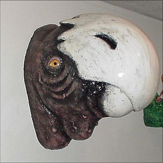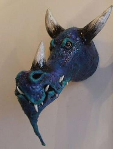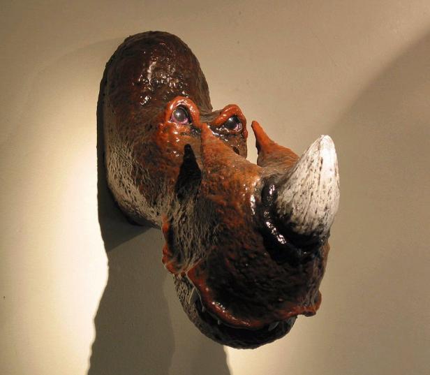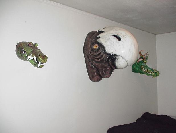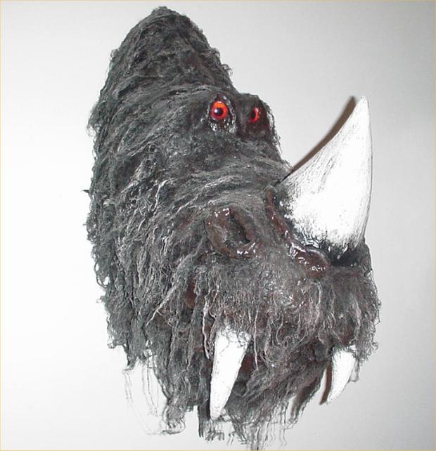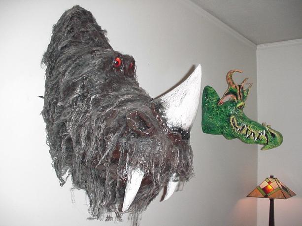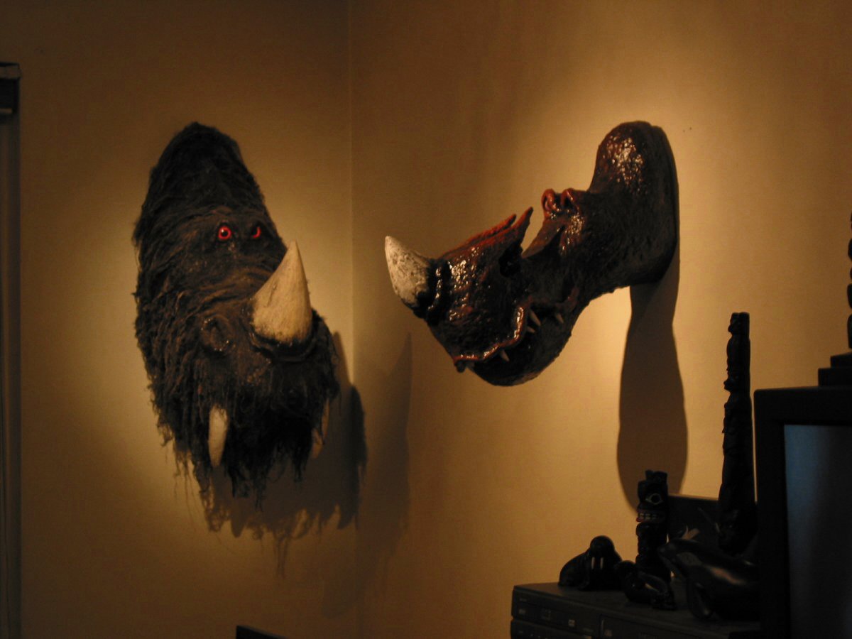 | The Bungled Jungle is "Earth's exclusive dealer in other worldly creatures" I first met Pat and Suzanne, the creators of the Bungled Jungle about 14 or so years ago and I bought a couple of pre historic looking fish heads from them to give to people as gifts. I would see them at different art shows that came through Denver from time to time and didn't really get interested in collecting their stuff until I moved to Ft Collins Colorado where they lived and made their creatures. I saw a really large rhino head and thought that some day I would own one. I had purchased several smaller pieces from them over the years but it wasn't until about 5 years ago that I went to their open house and found my first big piece...the "Sabre tooth woolly rhino". Ever since then I've bought a big piece from them almost every year ,until the African art addiction started eating into my budget and I started running out of wall space! Pat and Suzanne are great people and I know that their creatures are a little strange, but you have to know them I think to fully appreciate their art! Here is a link to their web site, it lists the upcoming shows they will be at around the country. |