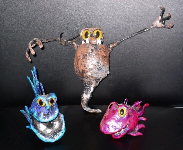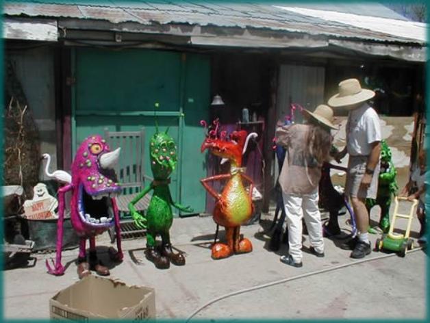 | WHAT IS THIS??? The Bungled Jungle is the collaborative effort of two silly people, Pat and Suzanne. Each sculpture is an original creation--no molds are used -- everything is one of a kind. The process starts with a metal/wood or plastic armature that is then built up with layers of rubber, plastic, metal, plaster and clay...each piece will have approximately 13 separate materials interlayered. It takes between 2 weeks to a month or more of daily dabbling to complete each sculpture--depending on its size and complexity. Not only are these monsters/beasts and varmints lovely to look at, they also come with COMPLETE DENTAL COVERAGE.... AND can be used as personal flotation devices in case of flooding. CLICK HERE to go to the Bungled Jungle's website! |