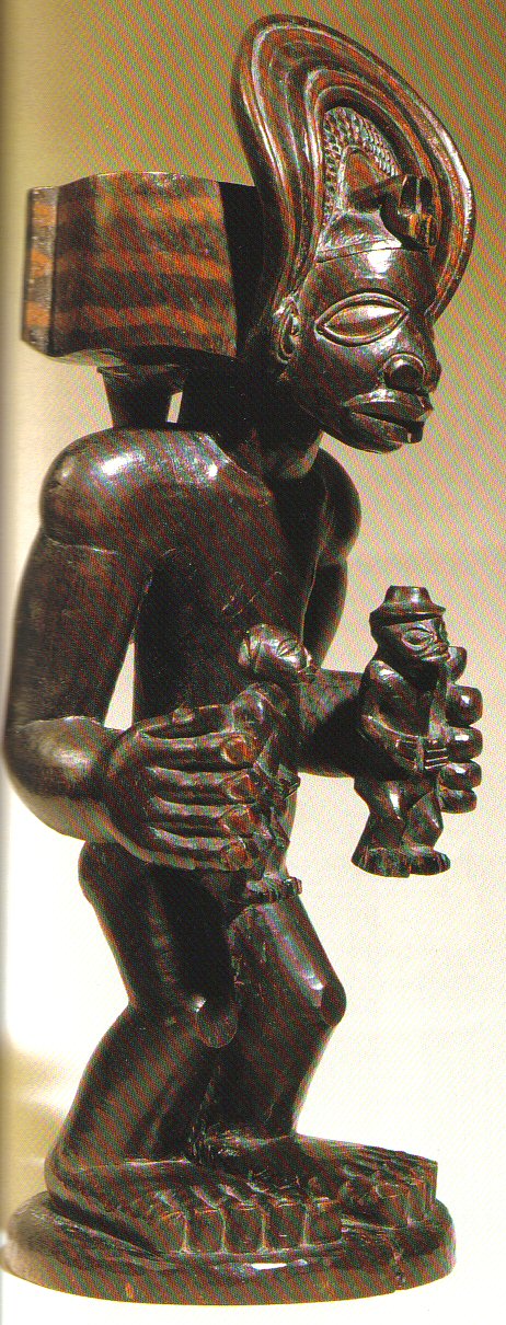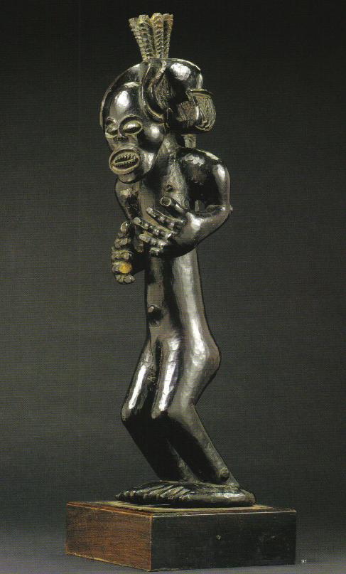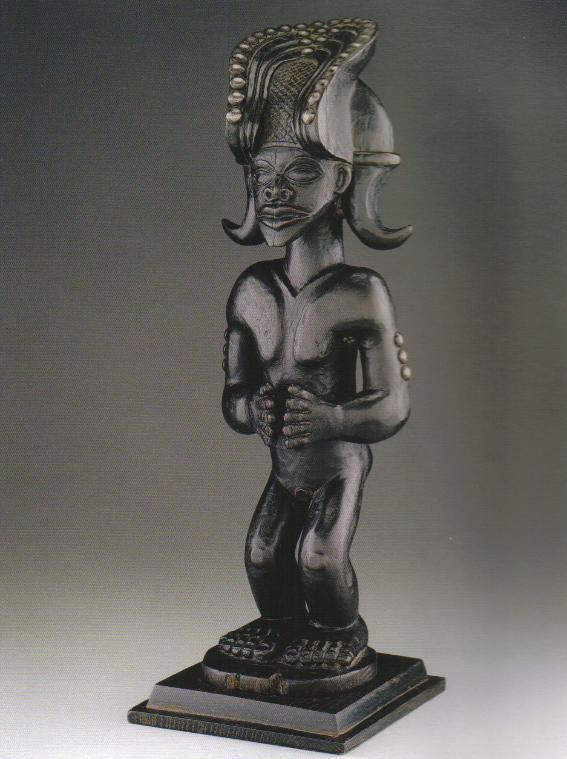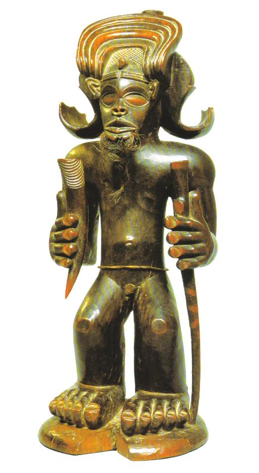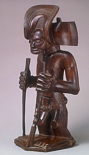 | CHIBINDA ILUNGA FIGURES also sometimes known as Tshibinda Ilunga As Chokwe chiefs increased in wealth and influence, the arts associated with chiefdoms blossomed. Local peoples over whom they asserted their power had long traditions of wood-carving, and their artists produced utilitarian, leadership, and luxury objects in a powerful and refined style. With its swelling musculature and preponderance of curving elements, the figure of Chibinda Ilunga shown here is typical of Chokwe style from this time. Such idealized representations of ancestors and important historical personages were carved by professional artists and served to underscore the rank and position of chiefs. The legendary hunter and culture hero is portrayed in full hunting gear. His muscular body, huge hands and feet, and broad facial features give a sense of power, while the delicate details of toenails and fingernails and other minute details give a sense of refinement. The sweeping, ornate headdress identifies him as a chief, and the long plaited and bound beard of real hair alludes to his aristocratic position. His massive shoulders are thrown back and, from the rear, emphasize concave forms of his back. The objects he carries refer to his role as hunter. In his left hand he supports a staff used for holding a sack of power substances. In his right he carries a medicine horn full of substances that assist the hunter, alluding to the role of the supernatural in hunting. Large hands and feet further allude to qualities skill and fortitude that serve him during long ventures. |