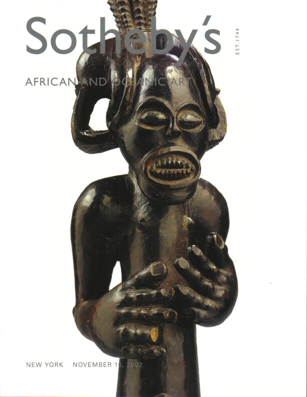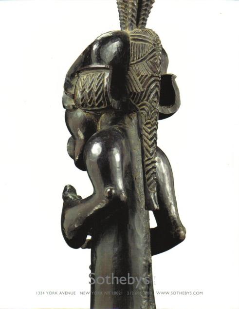 | Property from a South American Collection A RARE AND IMPORTANT TSHOKWE MALE CHIEF FIGURE mwanangana, the chief standing with large feet and lengthy articulated toes and ankles beneath bent legs and an elongated cylindrical torso, the muscular shoulders turned to the right leading to bent arms with enormous fan-like hands to the front, the large head with stylized facial features, the large oval mouth with defined lips baring filed teeth, and a small nose framed by protruding eyes encircled by oval lids, wearing an elaborate coiffure, mutwe wa kayanda, of multiple undulating bands and carved horns at the crown; exceptionally fine smooth and slightly glossy black patina. height 24V2in. 62.2cm This rare chief figure, mwanangana, or 'lord of the land', was carved in the Muzamba school, near the Kwango river in Angola. The very distinctive Muzamba style is expressed in the mask-like face and aggressive mouth in which the pointed teeth protrude slightly and are outlined by a defined, oval mouth. The Muzamba features contrast with the more naturalistic styles of the Muchiku or Mexico regions. See Bastin (1982: 120-121, figure 62) fora chief figure from the Mexico region, in the Museu de Etnologica, Lisboa. The offered, large-scale chief figure is the third Muzamba figure known of this proportion and particularly expressive quality, particularly in the mouth. See another formerly in the collection of Josef Mueller (Christie's 1979: lot 163) and a third published by Bastin (ibid: 117, figure 60). Of the latter two neither compares to the dynamism demonstrated in the offered figure's expressive features and turned, flexed gesture. In addition, the sculptor of the offered lot has placed great emphasis on the elaborate headdress. According to Bastin (ibid.: 112), the ceremonial headdress, mutwe wa kayanda, 'is one of the most pertinent indications of a prince's rank, and a figure that lacks this never bears any other sign which could identify it as portraying a chief. ...A chief may [at times be depicted] holding his hands in front of his chest in the fad gesture, a sign of power and strength.' Likewise, the winged headdress metaphorically evokes the black stork, khumbi, who is thought to embody the chief and his ancestors 'because the stork is the swamp-dwelling master of the water—the source of life and fecundity' (Bastin 1998: 18). $150,000-250,000 |