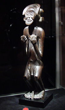 | Museum of Fine Arts, Boston From the Teel Collection Published in "Art of the Senses - African Masterpieces from the Teel Collection" Height 15” Brought from Angola to Portugal by M. Fereira at the end of the nineteenth century. Formerly in a Portuguese and then in a Chilean collection Acquired in 2003 Bibliography: Bastin 1989 Befitting their vigorous political expansion in the nineteenth century that supplanted the Lunda kingdom, Chokwe leaders commissioned bold sculptural figures and masks evoking the memories of their founders and cultural heroes. This idealized image of a chief (or mwanangana, "lord of the land") is among the masterpieces created by Chokwe artists of the Moxico region, which flourished in the nineteenth century. The figure's composed stance, with flexed legs and arms in front of the abdomen, and its serene facial expression allude to the wisdom and fortitude of Chokwe leaders, who assured the well-being of their communities. The large hands with elegantly carved fingers suggest the gesture of tad, a sign of strength and potency. The winged headdress decorated with brass tacks imported from Europe is called mutwe wa kayanda, part of the ceremonial regalia of Chokwe chiefs. |