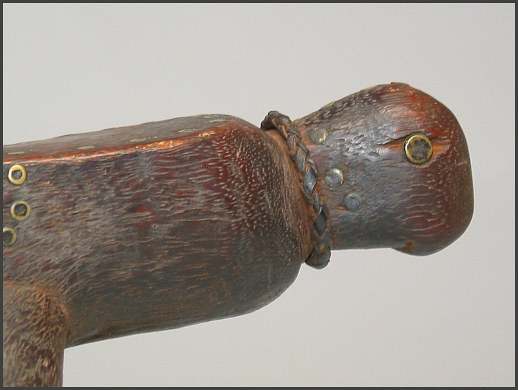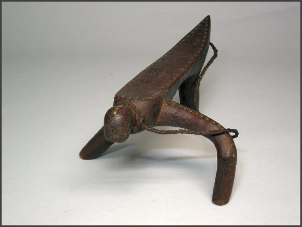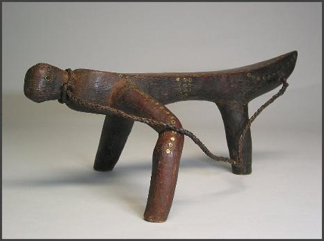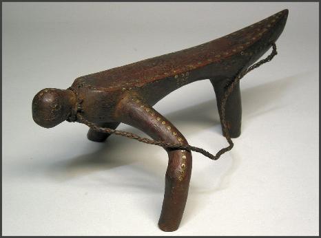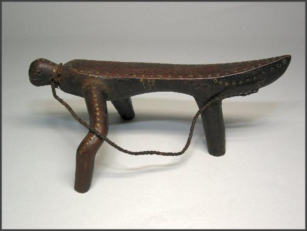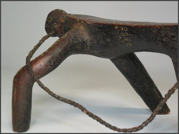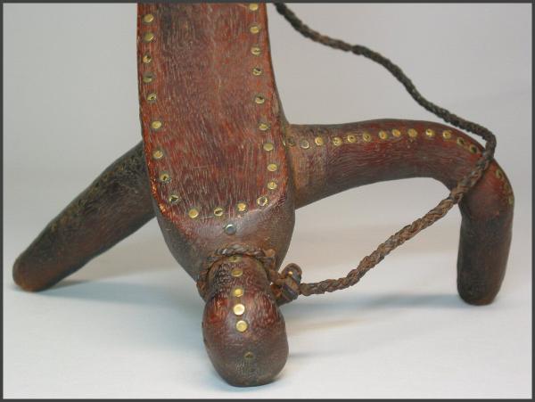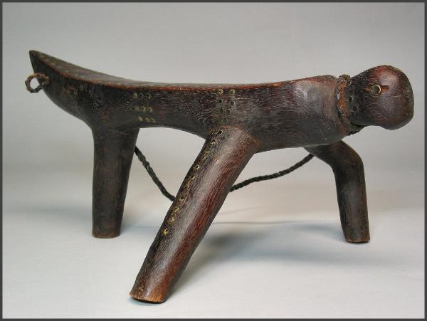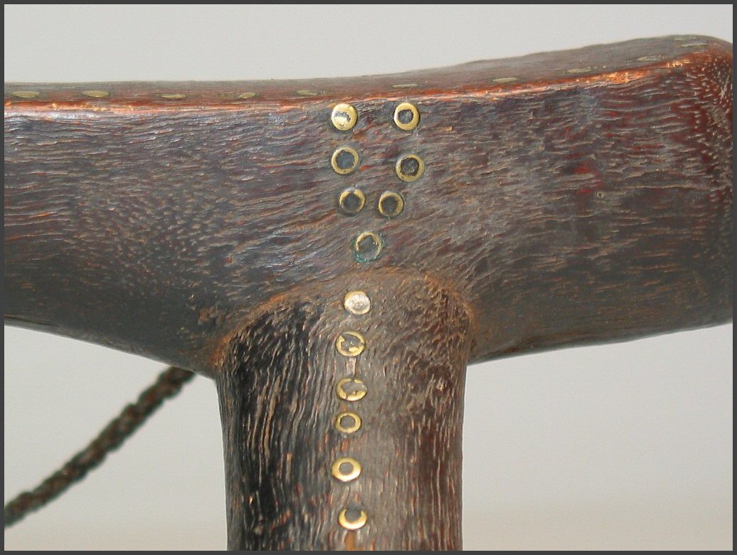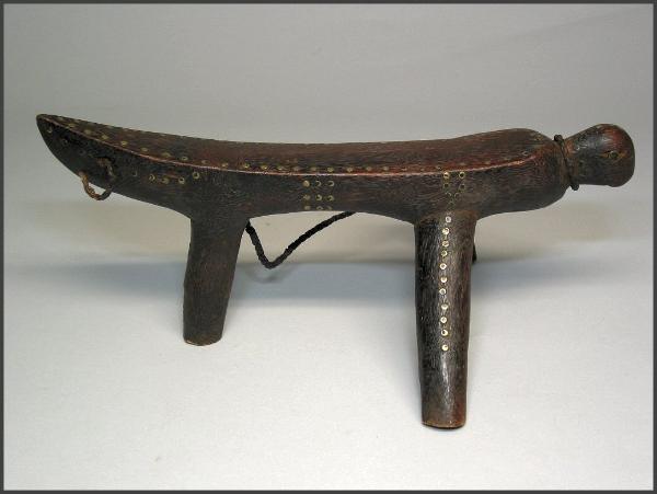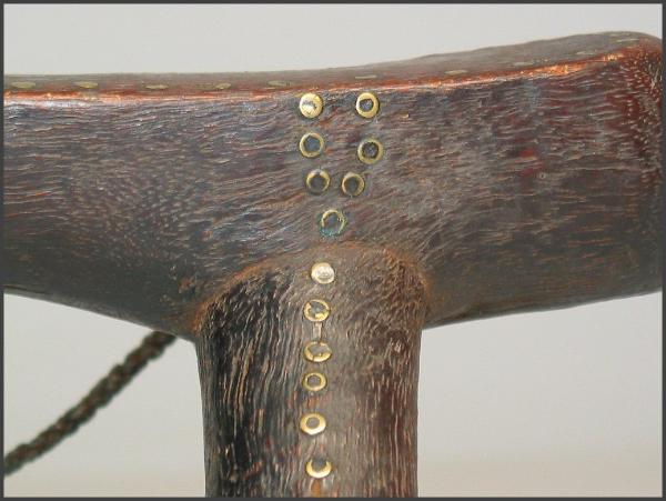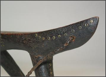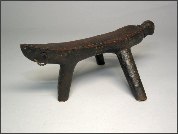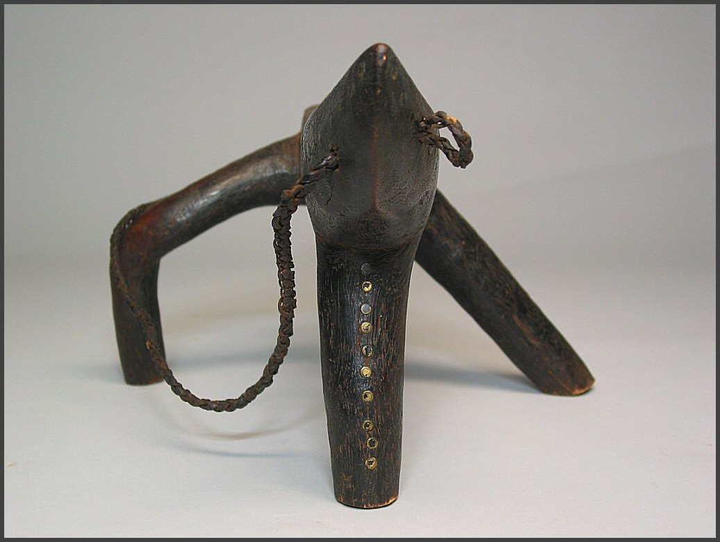 | Dinka (?) Nuer Nyuong (?) headrest/stool from Sudan 18.5" x 8" h Wood, metal, leather - wonderful patina to the wood. I love the animal qualities this headrest possesses, I also love the curvature of the front leg. Did I mention I love it?!?! It's a fantastic piece and pictures just don't do it justice. "As many peoples of eastern Africa make headrests/stools, it is difficult to attribute these objects to specific groups unless they have been collected in the field. Most are three-legged with one side flattened. Mack and Coote aptly describe the carving process as 'opportunistic', going on to say: 'The simple forms produced by the Dinka and Nuer are often little more than the result of judicious pruning of a found branch to produce a three- or four-legged stool or headrest. Zoomorphic features, such as a tail and a head, are sometimes "brought out". Among the Shilluk, Westermann noted that neckrests were used by men so that their hairstyles would not be spoilt during sleep. Many east African pastoralists regard coiffure primarily as an indicator of status. Among these groups a young man is entitled to begin wearing the distinctive coiffure that marks him as an adult only after he is initiated. As each member of the age set rises through the hierarchical society, changes in jewellery, hairstyle and feather decorations for the hair often mark each promotion. The use of headrests is often associated with this advancement and the headrests themselves become status svmbols. Whether this pattern is true for the Shilluk and Dinka is unknown, but it certainly seems likely as Shilluk men still wear elaborate coiffures, and among the Dinka headrests/stools are primarily used by older men (Jeremy Coote, personal communication). The Dinka multi-purpose headrests/stools also provide a convenient place to sit as it is not considered proper for elderly men to sit directly on the ground. No special skills were associated with the construction of headrests by the Shilluk and any man could make them alongside such activities as house-building and weapon-making. Headrests were made to resemble the forms of various animals, including ostriches and other birds. The symbolic importance of such objects is highlighted by the Shilluk belief that this headrest form was invented by Nyakang, their most important ancestor, culture hero and the founder of the Shilluk dynasty. The Anuak held that if the king-elect was able to balance on a three-legged stool during his investiture ceremony he was acknowledged as the rightful heir." William Dewey - Africa The Art of a Continent Click on any image to see larger version |