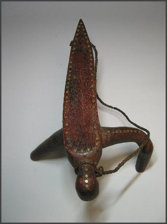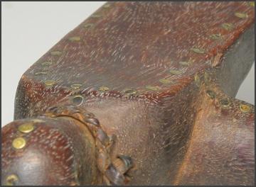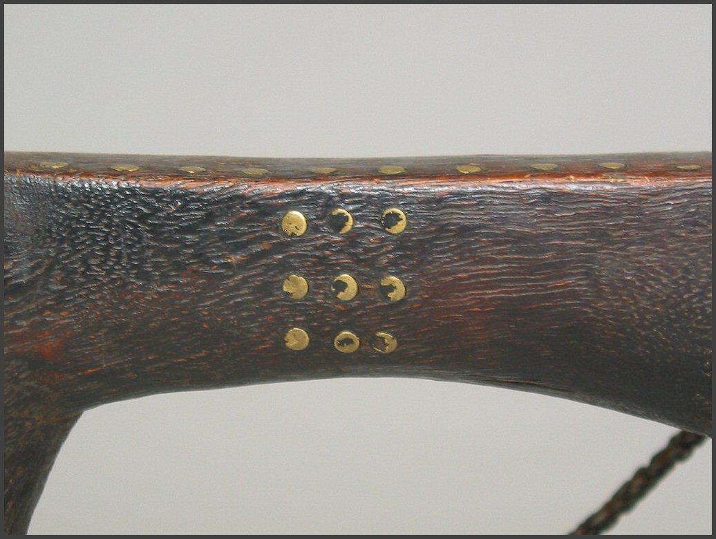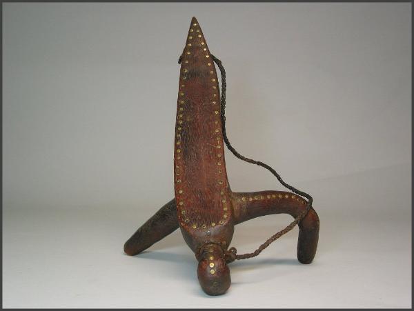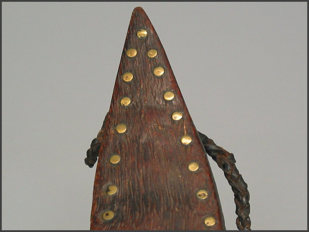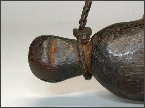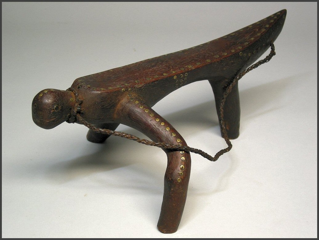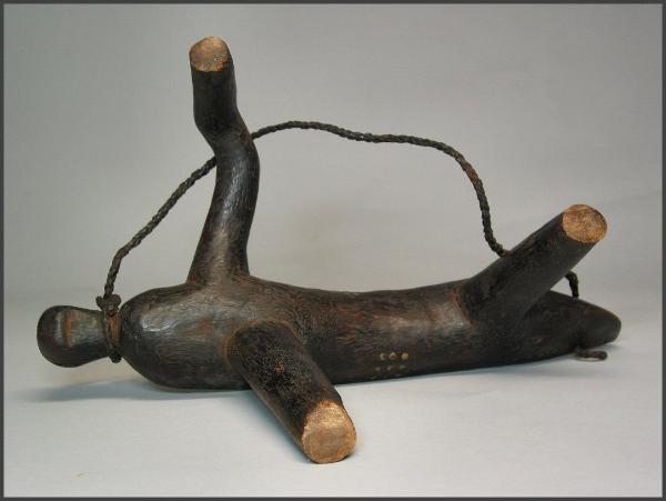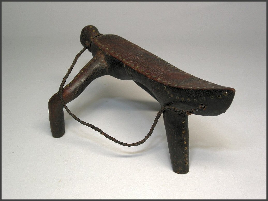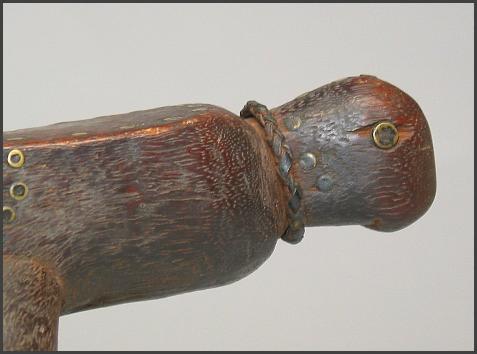 | Dinka (?) Nuer Nyuong (?) headrest/stool from Sudan 18.5" x 8" h Wood, metal, leather - wonderful patina to the wood. I love the animal qualities this headrest possesses, I also love the curvature of the front leg. Did I mention I love it?!?! It's a fantastic piece and pictures just don't do it justice. "As many peoples of eastern Africa make headrests/stools, it is difficult to attribute these objects to specific groups unless they have been collected in the field. Most are three-legged with one side flattened. Mack and Coote aptly describe the carving process as 'opportunistic', going on to say: 'The simple forms produced by the Dinka and Nuer are often little more than the result of judicious pruning of a found branch to produce a three- or four-legged stool or headrest. Zoomorphic features, such as a tail and a head, are sometimes "brought out". Among the Shilluk, Westermann noted that neckrests were used by men so that their hairstyles would not be spoilt during sleep. Many east African pastoralists regard coiffure primarily as an indicator of status. Among these groups a young man is entitled to begin wearing the distinctive coiffure that marks him as an adult only after he is initiated. As each member of the age set rises through the hierarchical society, changes in jewellery, hairstyle and feather decorations for the hair often mark each promotion. The use of headrests is often associated with this advancement and the headrests themselves become status svmbols. Whether this pattern is true for the Shilluk and Dinka is unknown, but it certainly seems likely as Shilluk men still wear elaborate coiffures, and among the Dinka headrests/stools are primarily used by older men (Jeremy Coote, personal communication). The Dinka multi-purpose headrests/stools also provide a convenient place to sit as it is not considered proper for elderly men to sit directly on the ground. No special skills were associated with the construction of headrests by the Shilluk and any man could make them alongside such activities as house-building and weapon-making. Headrests were made to resemble the forms of various animals, including ostriches and other birds. The symbolic importance of such objects is highlighted by the Shilluk belief that this headrest form was invented by Nyakang, their most important ancestor, culture hero and the founder of the Shilluk dynasty. The Anuak held that if the king-elect was able to balance on a three-legged stool during his investiture ceremony he was acknowledged as the rightful heir." William Dewey - Africa The Art of a Continent Click on any image to see larger version |