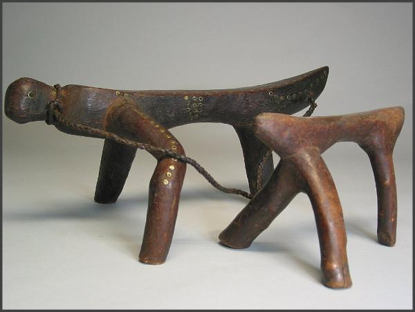 | These 2 headrests in my collection share similar styles. The smaller one on the right I have identified as "Rendile" on my website. I love both headrests because they share similar "animal" characteristics along with my other Dinka headrest in my collection shown below. |