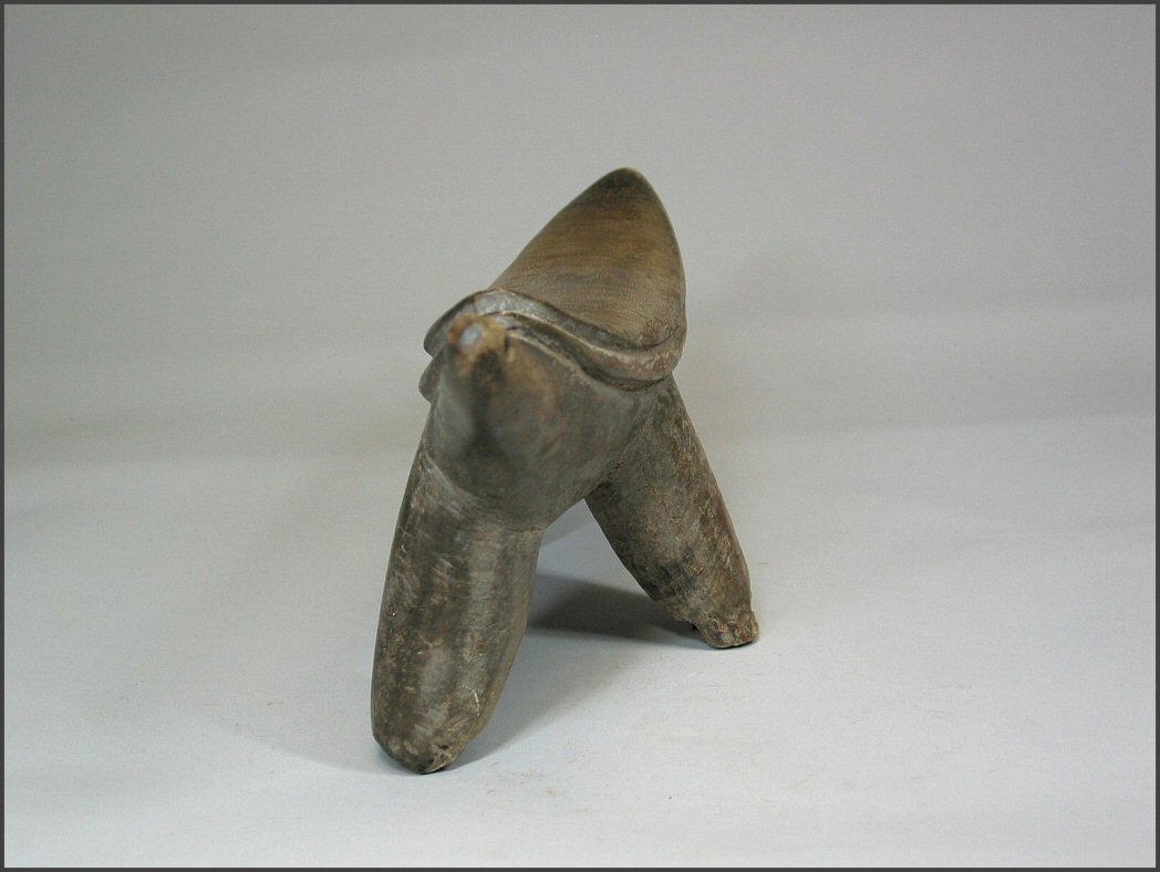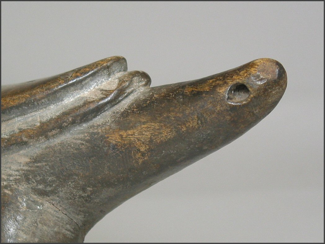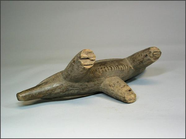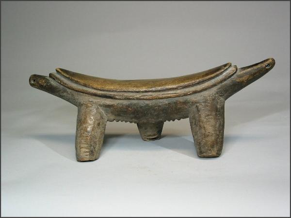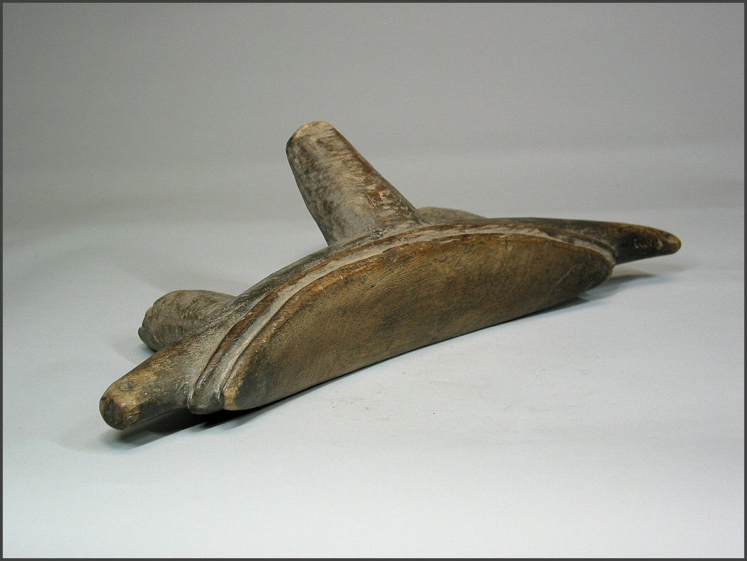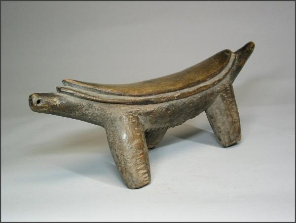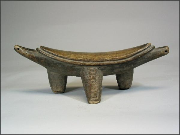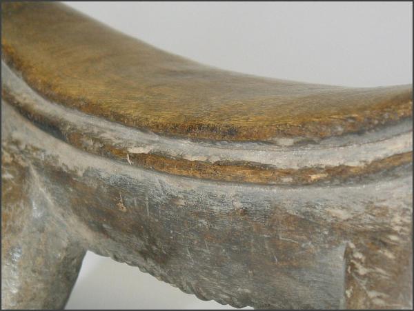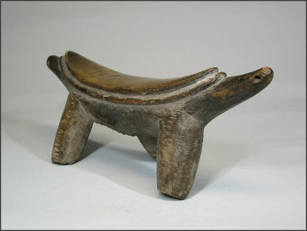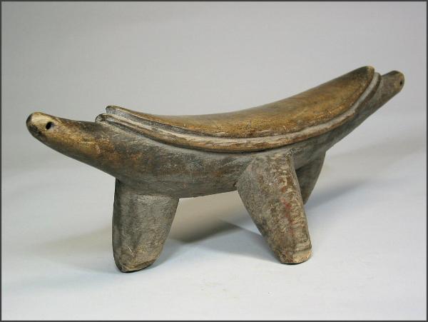 | Dinka (?) Nuer Nyuong (?) headrest/stool from Sudan A well used headrest/stool with a wonderful patina to the wood. "As many peoples of eastern Africa make headrests/stools, it is difficult to attribute these objects to specific groups unless they have been collected in the field. Most are three-legged with one side flattened. Mack and Coote aptly describe the carving process as 'opportunistic', going on to say: 'The simple forms produced by the Dinka and Nuer are often little more than the result of judicious pruning of a found branch to produce a three- or four-legged stool or headrest. Zoomorphic features, such as a tail and a head, are sometimes "brought out". Among the Shilluk, Westermann noted that neckrests were used by men so that their hairstyles would not be spoilt during sleep. Many east African pastoralists regard coiffure primarily as an indicator of status. Among these groups a young man is entitled to begin wearing the distinctive coiffure that marks him as an adult only after he is initiated. As each member of the age set rises through the hierarchical society, changes in jewellery, hairstyle and feather decorations for the hair often mark each promotion. The use of headrests is often associated with this advancement and the headrests themselves become status svmbols. Whether this pattern is true for the Shilluk and Dinka is unknown, but it certainly seems likely as Shilluk men still wear elaborate coiffures, and among the Dinka headrests/stools are primarily used by older men (Jeremy Coote, personal communication). The Dinka multi-purpose headrests/stools also provide a convenient place to sit as it is not considered proper for elderly men to sit directly on the ground. No special skills were associated with the construction of headrests by the Shilluk and any man could make them alongside such activities as house-building and weapon-making. Headrests were made to resemble the forms of various animals, including ostriches and other birds. The symbolic importance of such objects is highlighted by the Shilluk belief that this headrest form was invented by Nyakang, their most important ancestor, culture hero and the founder of the Shilluk dynasty. The Anuak held that if the king-elect was able to balance on a three-legged stool during his investiture ceremony he was acknowledged as the rightful heir." William Dewey - Africa The Art of a Continent Click on any image to see larger version |
