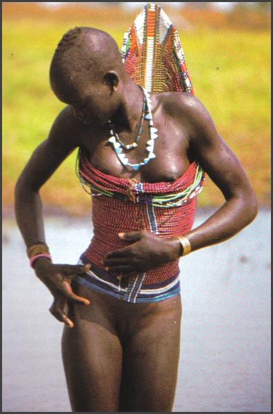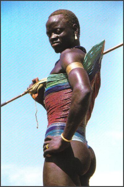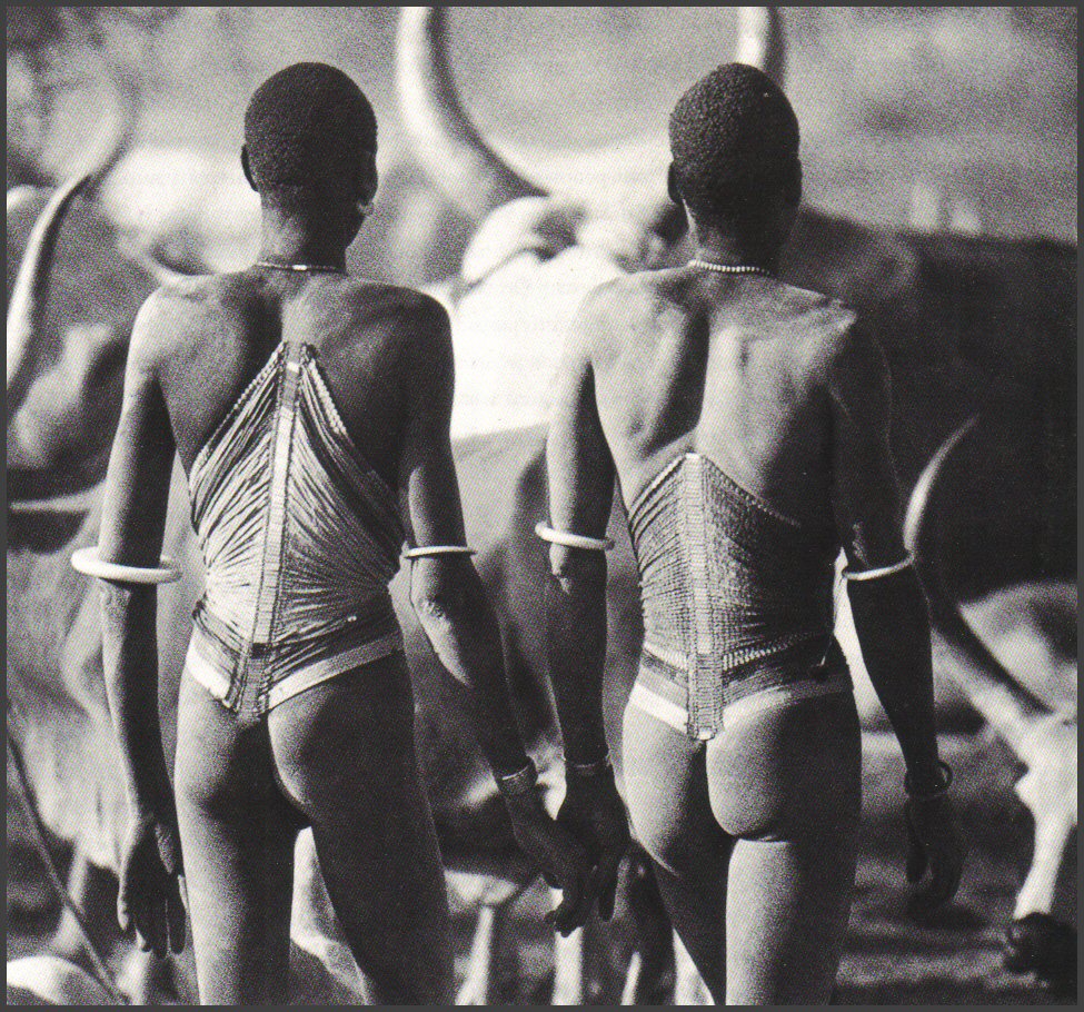 | Photos above and information below from the book - "PASSAGES" by Carol Beckwith and Angela Fisher "Seasonal meetings of young Dinka men and women take place during the dry season, when the vast plains of the southern Sudan become so dry that the herdsmen are forced to move to the swampy lands near the Nile, where water continues to support grazing for the animals. Dinka dry season cattle camps are run mainly by the young men and girls, older people having been left behind in the highlands. During this favorite, leisurely time of the year, young people are surrounded by their animals and enjoy a convivial social life. A young man accompanied by his favorite ox makes a special point of visiting his girlfriend, and he will sing songs extolling the virtues of the magnificent beast and the beautiful girl he is courting. Dry season camps not only pro¬vide essential grazing for the animals but also many opportunities for marriages to be made." ABOVE: The corsets worn by this couple are unusual because of the height of the projections at the back, which indicates that the wearers come from families rich in cattle. The corsets are worn until marriage, when they are removed. |