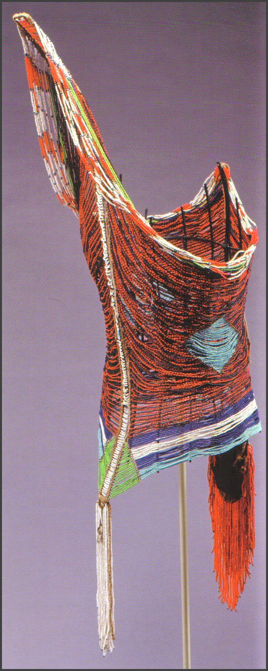 | Malual (male corset) Dinka, Sudan Second half of the 20th century Glass beads, cowries, plant fiber, cloth, iron 90.6cm x 46.5cm (351/2M x 18") CMC-2002.20.2-a/b In the collection of the Canadian Museum of Civilization "The Dinka beaded vest and corset shown in "Beads of Life" were collected in the southern Sudan during the mid-1990s. Ornaments of this type first came to the attention of the general public with Angela Fisher's Africa Adorned (1984), which instantly transformed the Dinka people into an exotic attraction at the very time when the Dinka were suffering from the war in the southern Sudan. Although worn only by the Dinka Bor, they have since acquired emblematic status among some Dinka war refugees, who make woollen versions of the corset and occasionally wear these for dances. These ornaments probably appeared during the second half of the twentieth century as glass beads became available in greater quantities in the southern Sudan. They are apparently "extensions" of formerly existing belts for men and necklaces for women. The male corset is easily recognized by its "horn" (fungi), flinging itself toward the sky at the back of the body. Cowrie shells (gak) are sewn at the front and back of the female vest, probably to protect the wearer and ensure her fertility. Both corset and vest come in different colors, each linked to a particular age group. A man in his early twenties would have worn the corset, and a married woman in her late twenties the vest." From - Beads of Life: Eastern and Southern African Adornments by Mary-Louise Labelle |