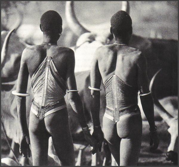 | 2 Dinka men wearing corsets Photo from Carol Beckwith and Angela Fisher's "African Ceremonies" "Dinka herders in traditional beaded corsets walk among their cattle in their dry season camp. The tight beaded corsets indicate the men's position in the age-set system of the tribe. The corsets are first sewn in place at puberty and not removed until the wearer reaches a new age set. Each group wears a color-coded corset: a red and blue corset indicates a man between fifteen and twenty-five years of age; a yellow and blue one marks someone over thirty and ready for marriage." |