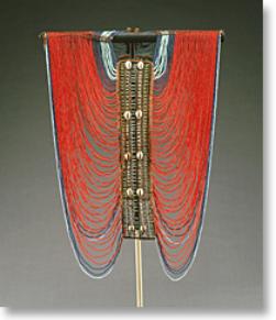 | The Dinka corset shown above is in the collection of the Metropolitan Museum of Art in New York City Male Corset, 2nd half of 20th century Sudan (Dinka peoples) Glass, fur, shell, and vegetable fiber; L. (a) (center back) 30 in. (76.2 cm), L. (b) (center back) 16 in. (40.6 cm) Isabel Shults Fund, 2001 (2001.177a, b) Description "This extraordinary beaded corset is a rare example of the everyday wear of Dinka men. Because the Dinka peoples are herders, wandering the vast plains of southern Sudan, portable possessions are very important. Like many southern and eastern African cultures, the Dinka have traditionally focused on the human form as the primary method of artistic expression. Because these garments are used to communicate characteristics such as gender, age, wealth, and ethnic affiliation, we can infer a significant amount of information about the past wearer of this object. In particular, the red-and-black patterning indicates that the corset was worn by a male between the ages of fifteen and twenty-five. The decoration of cowries, along with the extreme height of the back, marks the wearer as someone of considerable wealth. The addition of the fur skirt (possibly cattle hair) is significant. The Dinka, who have traditionally gained their livelihood from their herds, value their animals as a source of aesthetic inspiration and a link to the spiritual world. As highly prized commodities, beads are a sign of wealth and status among the Dinka peoples. The polychrome glass beads that make up this garment are European, while the cowries and fur skirt are undoubtedly of local origin." (Entry written by Emily Martin) SOURCE |