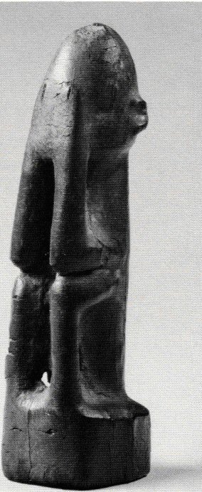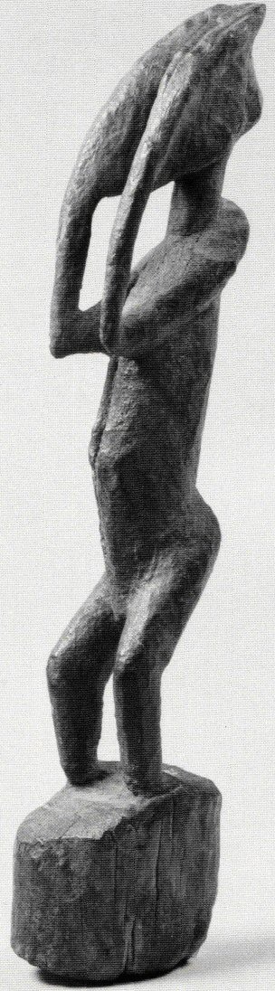 | The other interpretation for these figures... Figures making this gesture are frequently referred to as images of "Dyougou Serou," said to be a character from Dogon myth who committed incest with his mother, the earth, and who therefore hides his face in shame. This often-repeated interpretation seems to have originated in Jean Laude's studies of Dogon sculpture (Laude, 1964: 64; Laude, 1971: 217; Brooklyn Museum, 1973: nos.1-3). It has little basis in the copious literature about Dogon myth and ritual, except for Michel Leiris' brief mention of a similar figure in the Musee de l'Homme. Leiris suggested that the figure hides its face "'parce qu'il a honte,'" (because he is ashamed) but he did not specify why, not did he identify the figure with any particular being or event in Dogon myth (Leiris, 1936: 194).(1) Beginning in the mid-1950s, the mythical ancestor "Dyongou Serou" appears in some of the writings of Marcel Griaule and Germaine Dieterlen, and this may be the source for Laude's misspelled identification of the image. Dyongou Serou, a hunter and healer, is one of the original eight ancestors of mankind, along with Amma Serou, Lebe Serou, Binou Serou, and their four female twins whom they exchanged as wives. Of the four males, Dyongou Serou is associated with Ogo (sometimes called the jackal, and later the Pale Fox), a member of the previous generation of mythical beings who disturbed the order of the newly created universe by violating his placenta, the earth, thereby committing incest with his mother (Griaule, 1965: 21—22; Griaule and Dieterlen, 1986: 209). Dyongou Serou followed Ogo's disruptive example by cultivating the forbidden grain, fonio (Digitaria exilis), and stealing land from sacred fields. As a result of this transgression of the established order, Dyongou Serou died and caused death to spread among mankind (Dieterlen, 1956: 110, 114, 118-19; Griaule and Dieterlen, 1986: 41, 51, 404 n. 327, 451).(2) Nowhere in these accounts is the specific gesture of covering the face mentioned in connection with Dyongou Serou, nor is his remorse or shame at his act described. There is no indication that, in Dogon terms, covering one's face is an appropriate expression of these emotions. Little is known of the ritual context of figures performing this gesture, or whether the aspects of the myth relating to Dyongou Serou have any bearing on their function. Given that the entire question of how mythological content is expressed in Dogon sculpture remains largely unanswered, interpreting figures like this as a specific mythical being is problematical. 1. Quotation marks were used by Leiris in the original, making it unclear whether this was his own interpretation of the Musee de l'Homme figure or an assumption based on information collected among the Dogon. In an autobiographical essay originally published in 1939, Leiris was very much concerned with the idea of shame and with transcending the limitations society places on the individual, especially in regard to his sexual activities (Leiris, 1984). This concern may have colored his view of the Dogon image. 2. In The Pale Fox, Griaule and Dieterlen state that as the first person to die, Dyongou Serou is the source of the Dogon institutions that deal with death and masks, funerals, dama ceremonies, and the sigi ceremony held every sixty years (1986: M). Earlier studies of Dogon masks do not mention Dyongou Serou at all, and the source of death among humanity is attributed to other mythical beings (Griaule, 1938; Dieterlen, 1941; Leiris, 1948). The existence of many versions of the same myth jomplicates the already problematical task of interpreting Dogon visual imagety through specific references to myth. Published: Paris, Palais d'Orsay, 1977: lot 9.  |