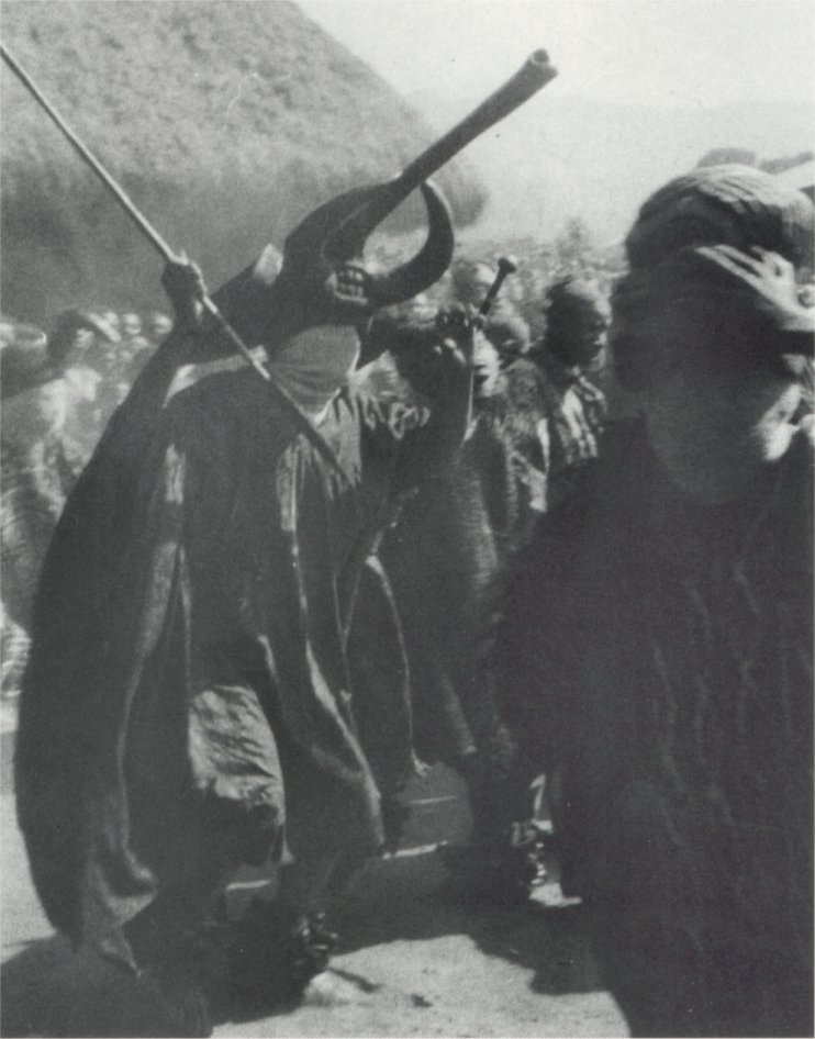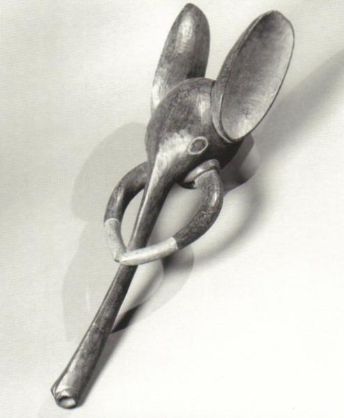 From Sotheby's, May 1994 Property of a New Mexico Private Collection Lot 140 A Cameroon Elephant Mask, with rounded head and exaggerated concave oval ears, supporting an elongated trunk with two large nostril cavities, and a gaping mouth bearing distinctive teeth, with two horns emanating from each cheek in a curved fashion overlapping the trunk, incised almond eyes; dark brown patina with traces of white, red and yellow pigment. Length 40 3/4 in. (1.03 m.) Cf. Ross, Doran, Elephant, The Animal and its Ivory in African Culture, 1992, p 254. Estimate $4,000-$6,000 |