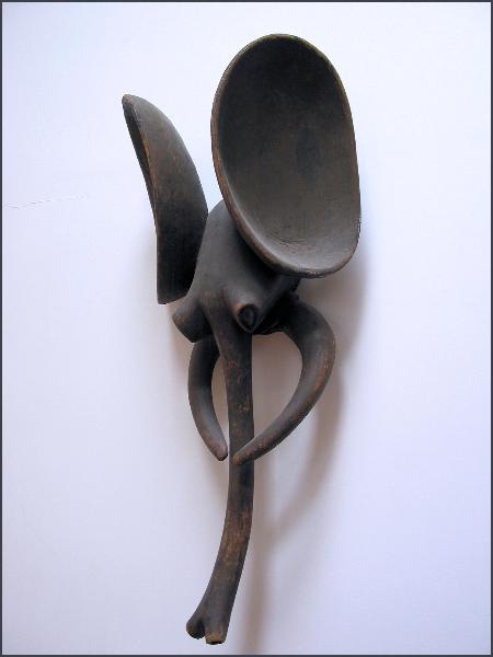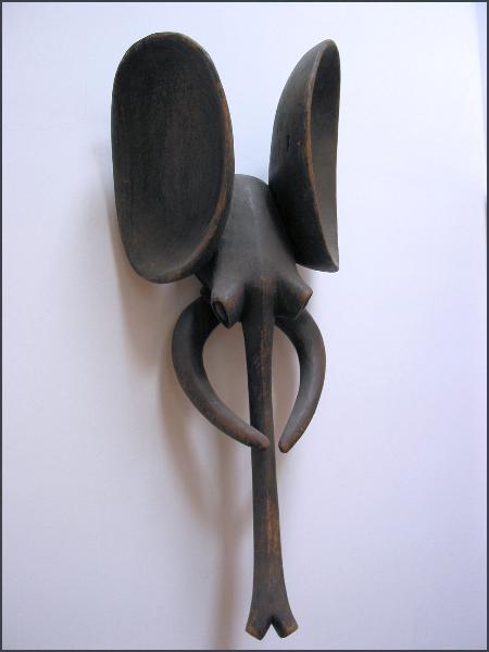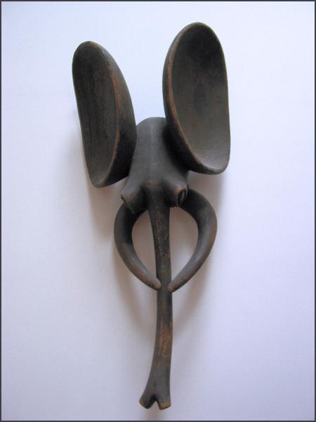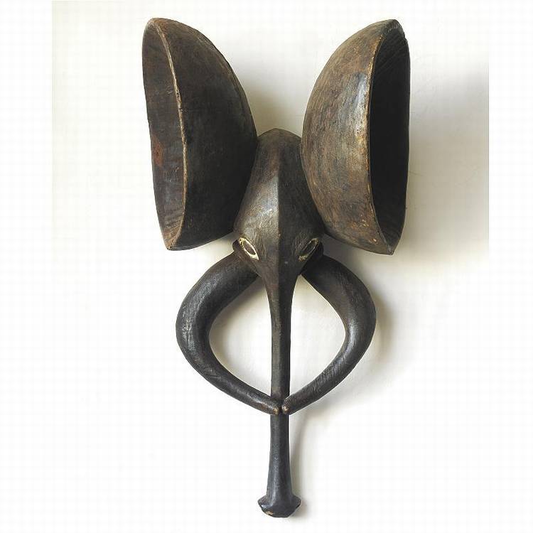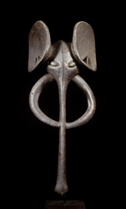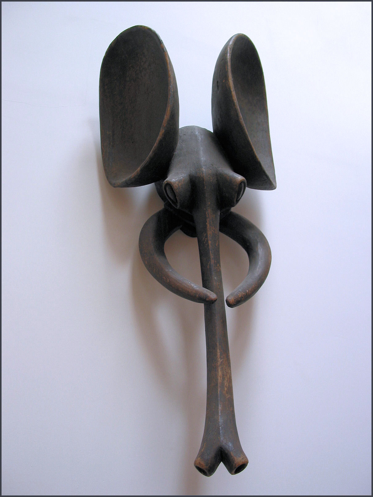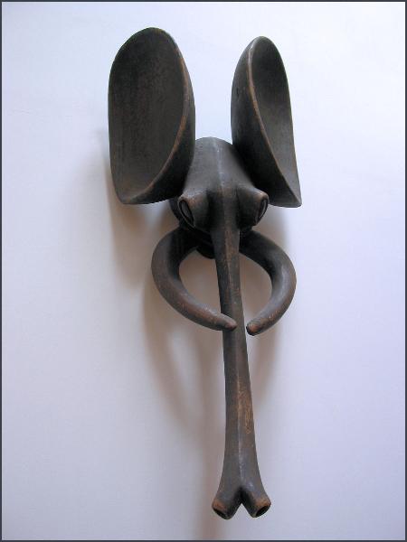 Mask, Bamileke; Cameroon Wood, remains of sacrificial material; H. 43 1/2" Most elephant masks in the form of a wooden crest originate from the centers of Oku and the Babanki area. Masks of this type belong to an ensemble of some twenty masks owned by royal lineages and chiefs that are performed during funerals and annual festivals. The elephant appears last in these masquerade performances and assumes an exalted position as protector from enemies and sorcery. Depiction of the elephant or use of its ivory or tail hairs refers to wealth and influence but also makes allusion to an elephant's strength and destructive powers. The interplay of elongated lines and rounded arcs adds both grace and power to this fantastic composition. From the website for the book - Remnants of Ritual - Selections from the Gelbard Collection of African art http://www.remnantsofritual.com/gallery/058.html |
