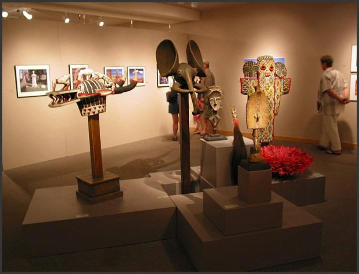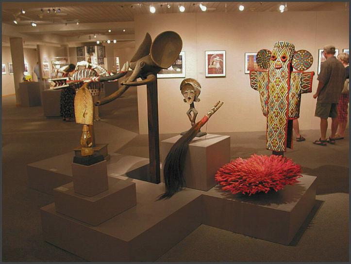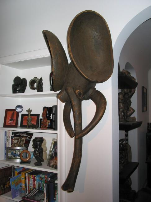 BABANKI STYLE ELEPHANT MASK, also known as BALI ELEPHANT MASK- WESTERN GRASSLANDS Most of the wooden masks from the Cameroon Grasslands of this type belong to an ensemble of some twenty masks owned by royal lineages and chiefs that are performed during funerals and annual festivals. These lineage masks include both anthropomorphic and zoomorphic types, the latter representing such animals as buffaloes, apes, sheep and various species of birds. Elephant masks are only occasionally included in this group, since the elephant, like the leopard, is considered a royal animal and the use of an elephant mask is therefore the special privilege of certain lineages. Whenever an elephant masquerader is present, he assumes the second most important position after the human kam masquerader. The elephant figure is the first to appear on the dance ground and the last to leave it, and in accordance with his status, his movements are stately and slow. The elephant mask is worn horizontally on the head and can be classified in the well-known Babanki style of the northwestern Grasslands. Sources: A History of Art in Africa / Africa - The Art of a Continent / The Tribal Art of Africa Click on any image to see larger version Provenance: Ex M Barron collection Previously M Forsyth collection This mask and I have a little history, I have wanted it for years now and I am very glad to now have it in my collection. I think it's fantastic! This object will be in the exhibition "Collectors Collect - Works from Denver Private Collections" from October 9th 2006 to January 5th, 2007 The 3 photos below were taken at the opening reception for the exhibition. |