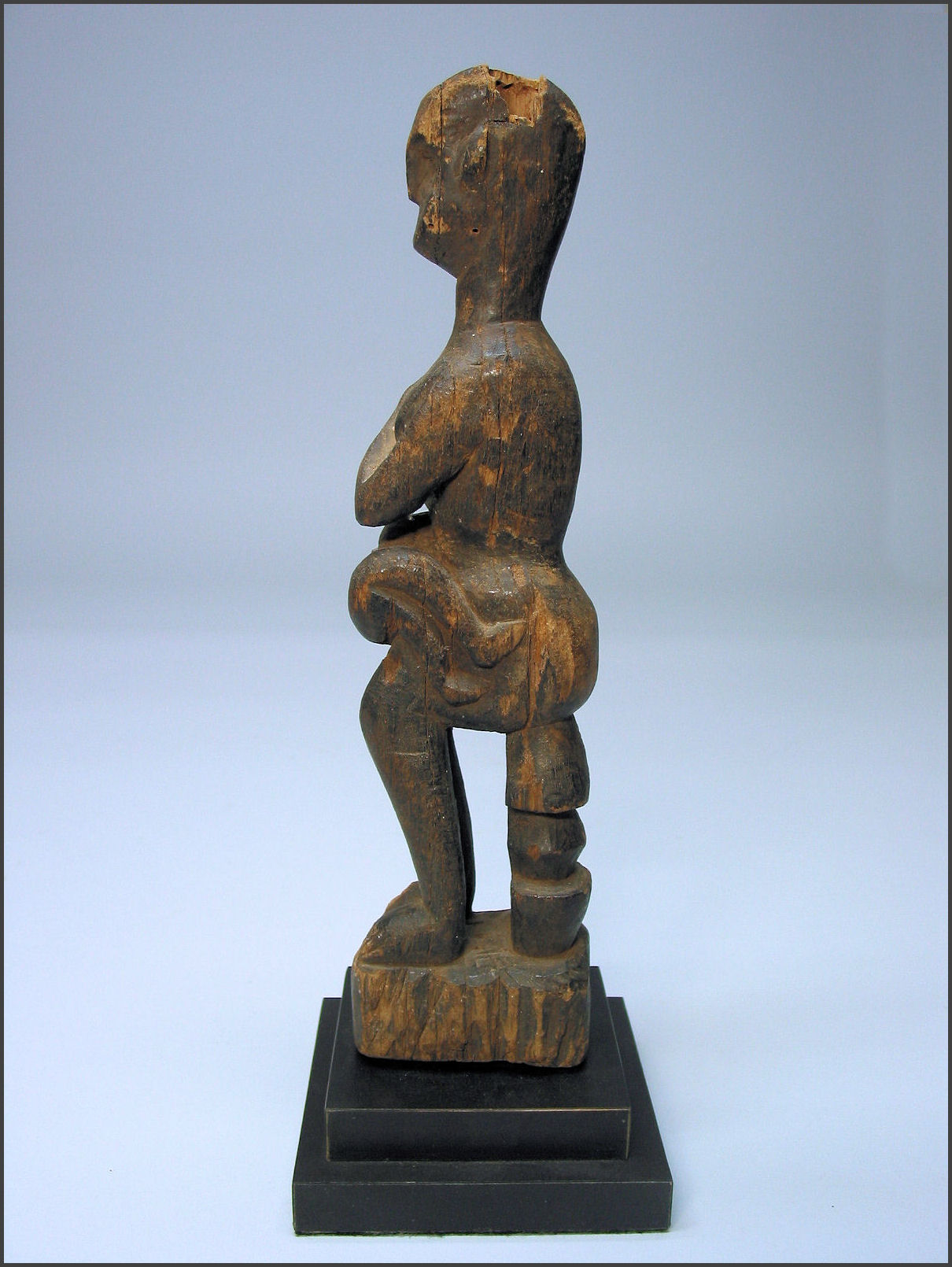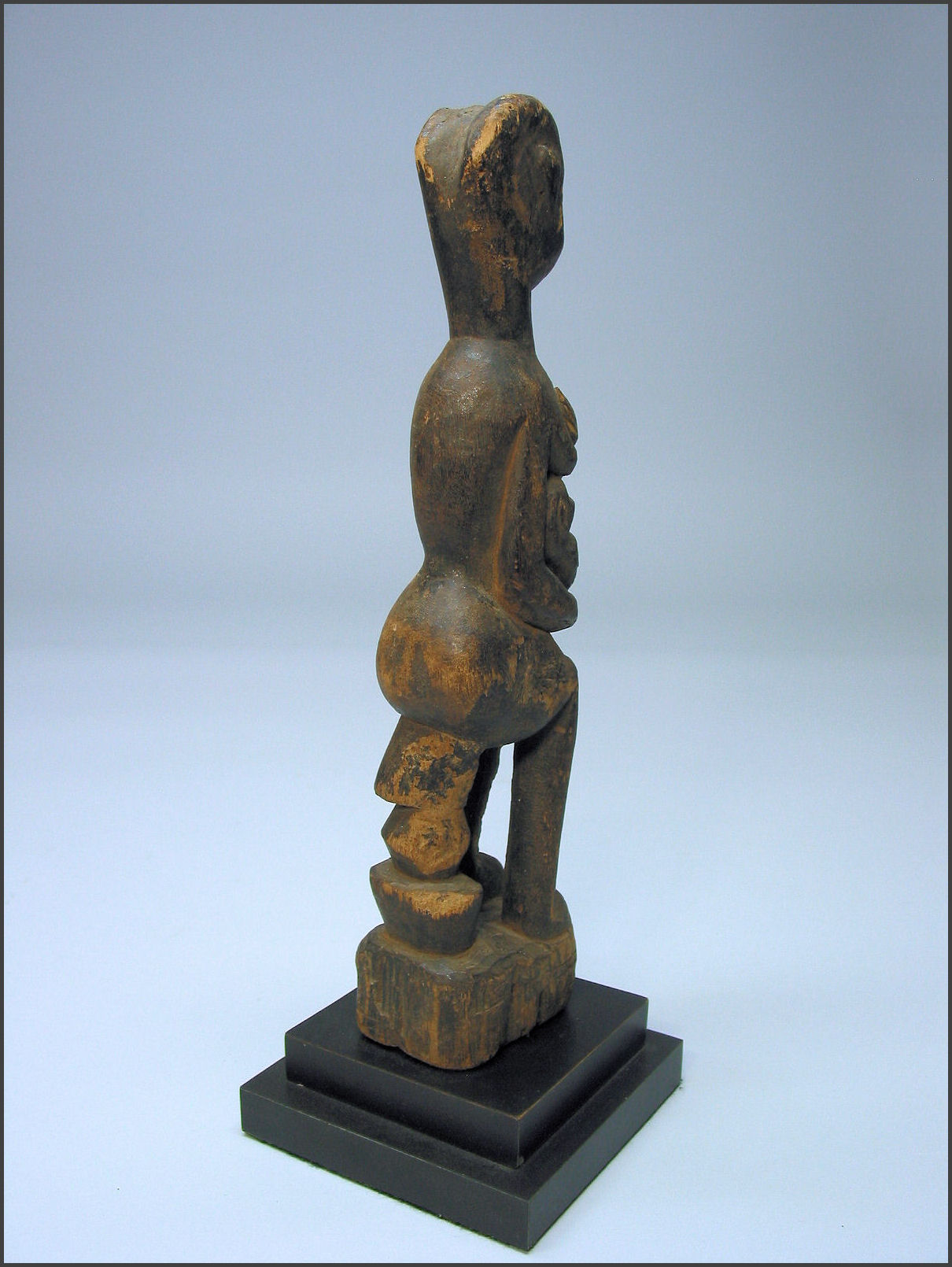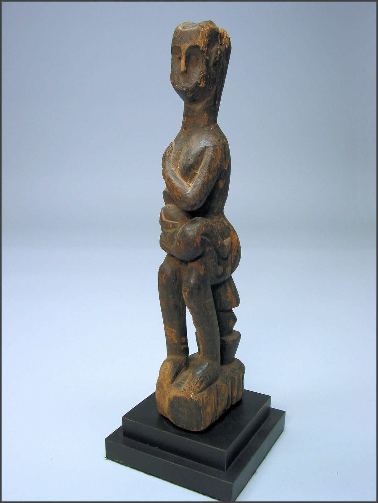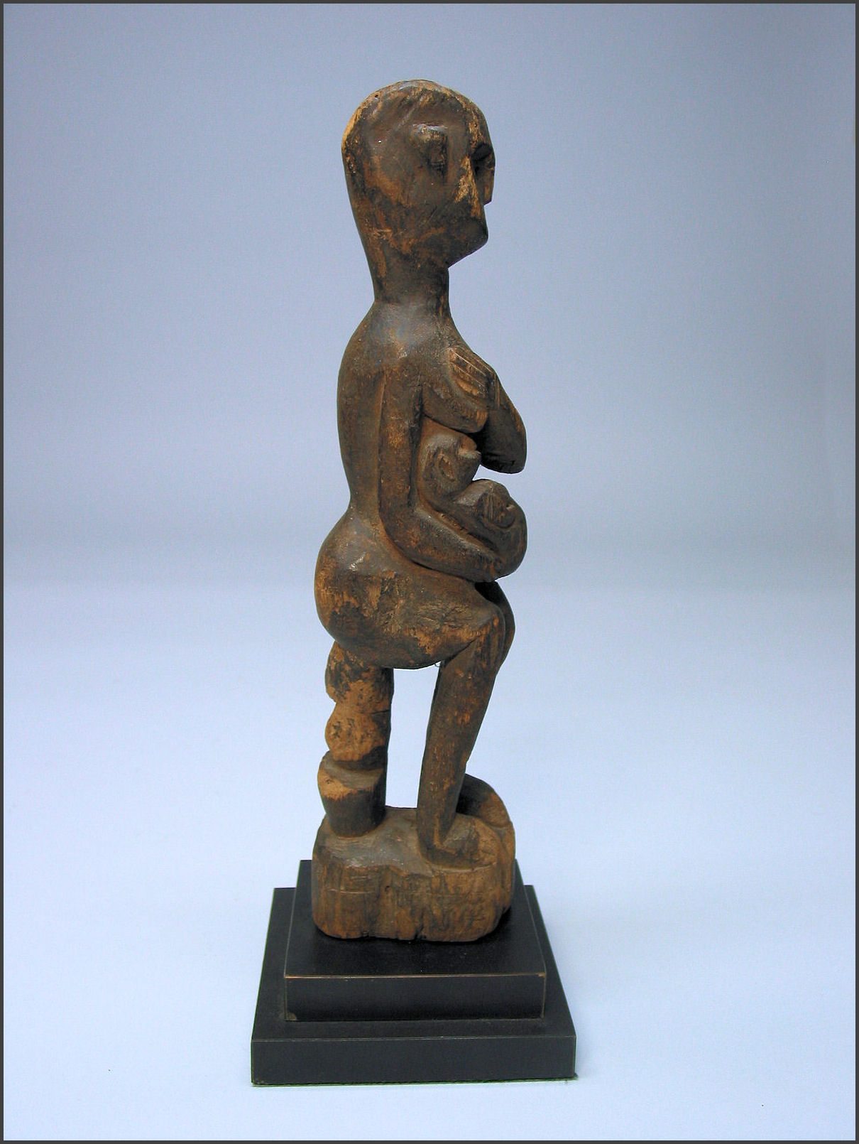 | Kwere maternity figure, Tanzania wood, pigment 13 1/4" tall Early 20th Century, definite signs of age and use Ex private collection, US The curled position of the infant's legs provide a nice counterpoint to the bend of the mother's left arm and are a nice echo of the curvilinear elements that constitute the overall form of the figure. |