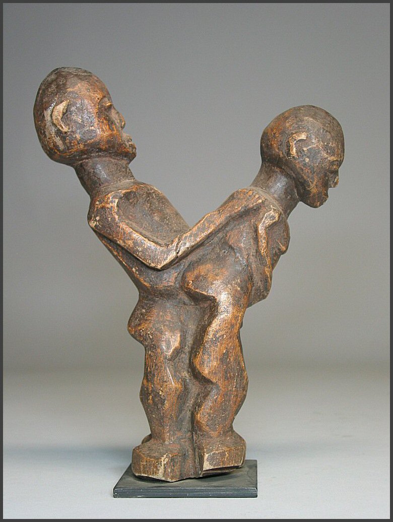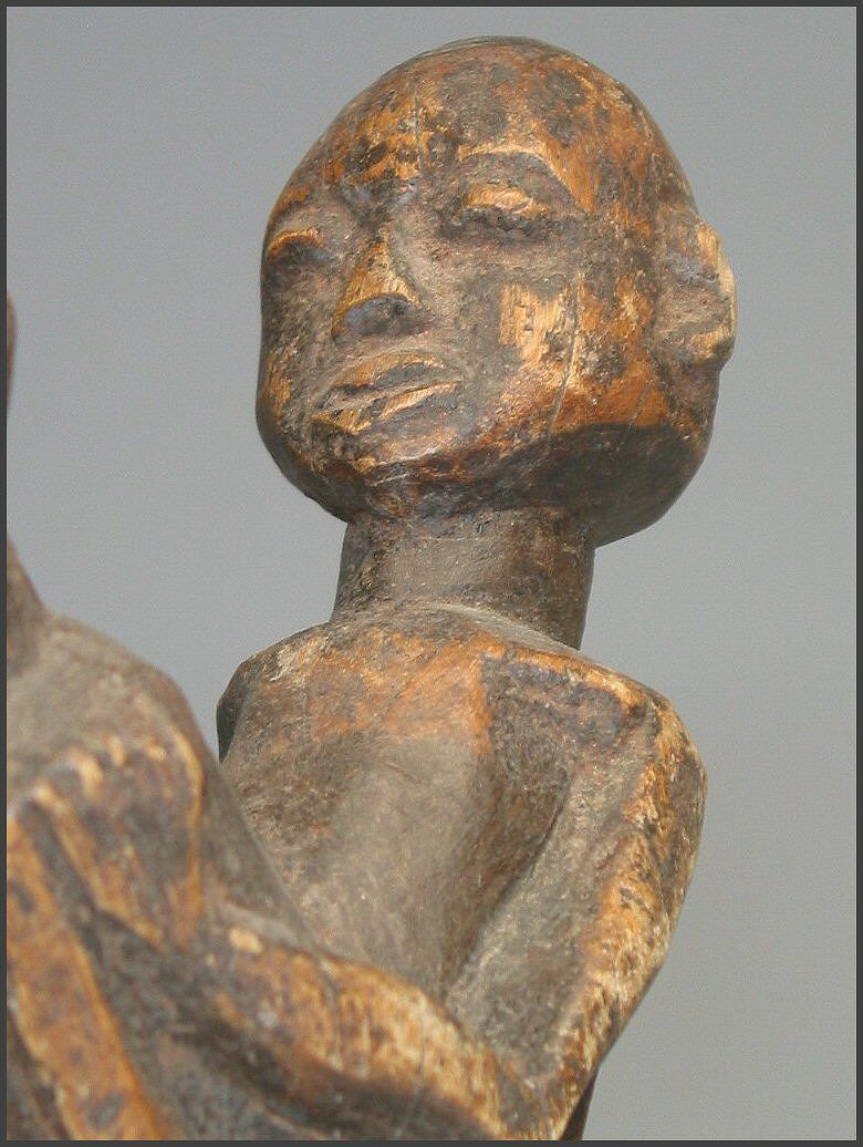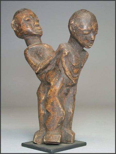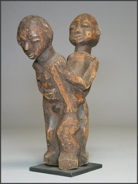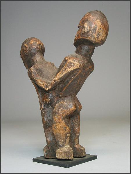 | Lobi Bateba Betise Acquired from Tim and Bobbi Hamill, Hamill Gallery of African Art, Boston 10.75 inches tall - a really fantastic example in my opinion "Statuettes depicting a man and a woman making love (the man always positioned behind the woman), the thilbou khe mounkha, which are prescribed for single men so that they find a wife or to women to avoid sterility or wished to have a child." from Julien Bosc - Lobi Art and Culture "Copulating couples or maternity figures are believed to enhance the fertility of women living in the household" from Tribal Arts of Africa |