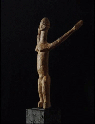 | Another type of figure, which is actually African, that I have also fallen in love with that is similar in form with the raised arms like the Lobi bateba duntundara figures is the Lengola ubanga nyama figures. The photo above is the wonderful display in the Hamill Gallery in Boston, my figures are the tallest one directly in the middle in the back and the shorter one on the far right. CLICK HERE to see my pieces in a new window |