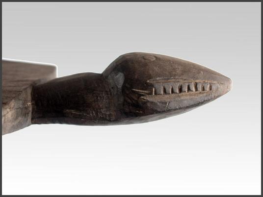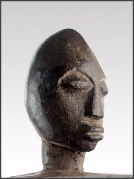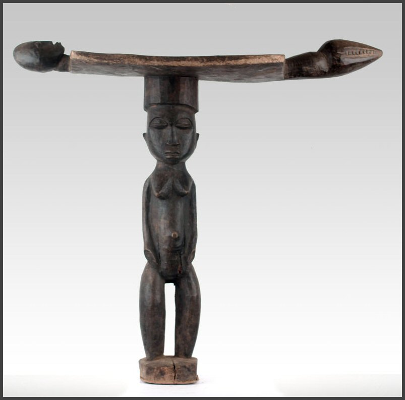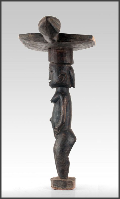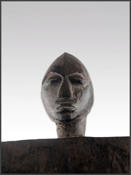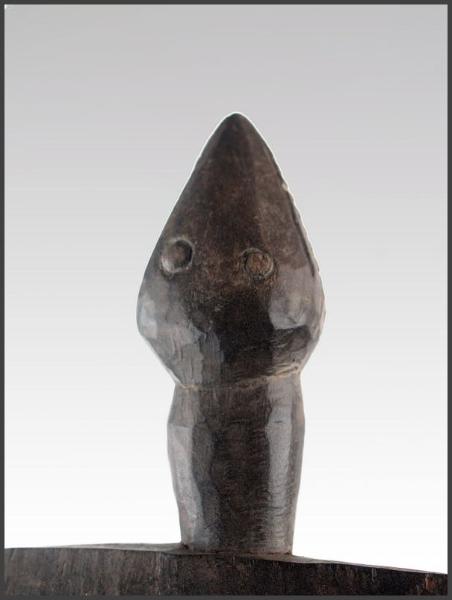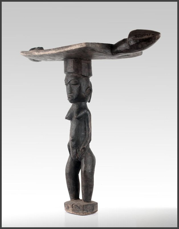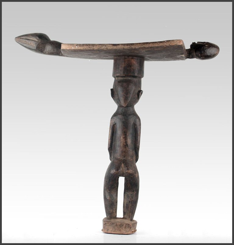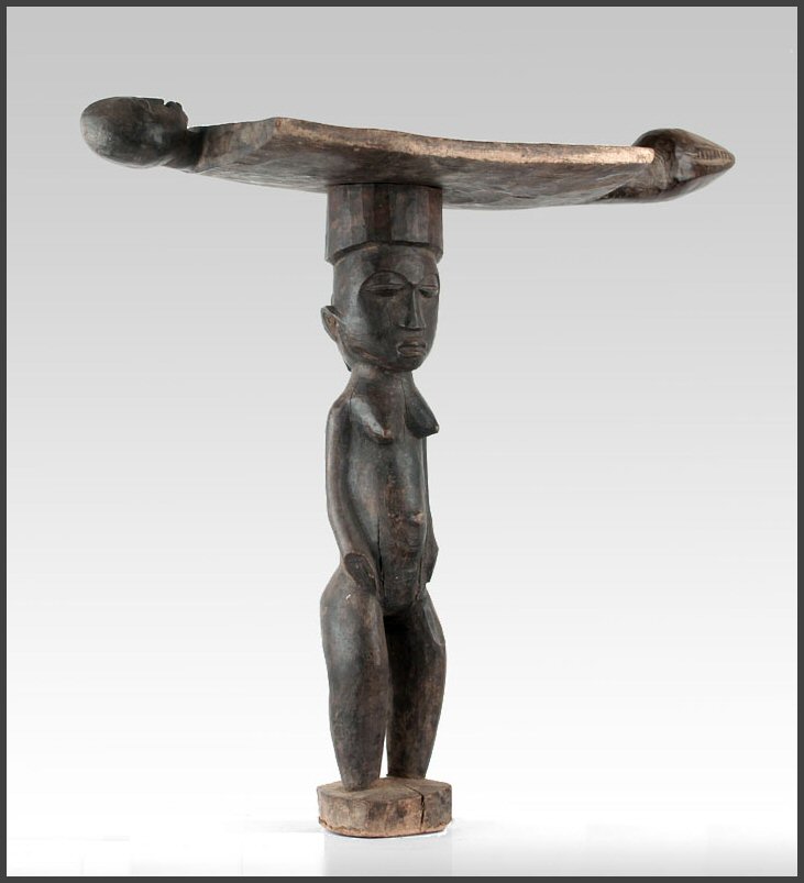 | Lobi figural stool (Siège) A rare and atypical Lobi stool, uprising from a circular base, bent legs, hands close to the body a female sculpture with a large head is supporting a flat panel with two "handles", one in shape of a human head and one of an animal - probably the head of a serpent; a blackened (the sculptural part) and natural brownish (the panel part) patina. 18" tall Acquired from Wolfgang Jaenicke - Tribal Art Forum For images of a similar style Lobi figural stool, see illustrations on pages 124-125 in the book LOBI MAGIC from Galerie Flak, Paris All photos on this page of this object were taken by Tribal Art Forum and used with permission |