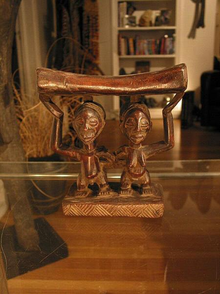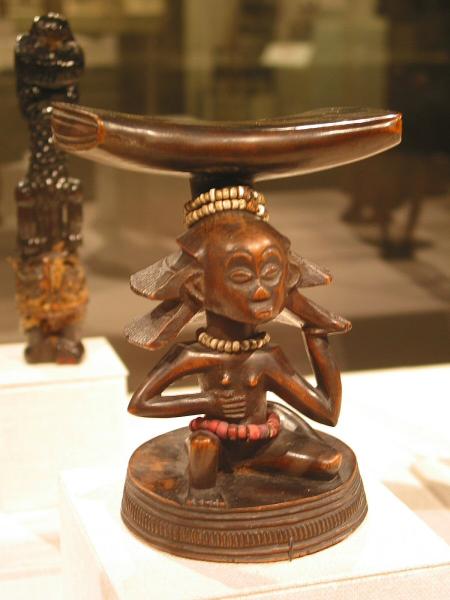 | Above is an example of a Luba headrest in the Metropolitan Museum of Art in NY Neckrest: Female Figure, probably 19th century Democratic Republic of Congo; Luba or Shankadi Wood, beads; H. 6 3/8 in. (16.2 cm) Gift of Margaret Barton Plass, in Honor of William Fagg, C.M.G., 1981 (1981.399) The Luba peoples occupy a land of rivers and savanna in the southeast of what is today Democratic Republic of Congo. As early as the seventeenth century, the Luba headed an extensive, centrally organized state structured on the principles of divine kingship and rule by council. The widespread trade networks in the region produced individuals of great wealth and prestige who commissioned fine works of art for personal and political use. Used by a member of the Luba elite, this diminutive sculpture elevated the head of its resting owner. Its function may appear prosaic but it served an important purpose by protecting the sleeper's elaborate coiffure, itself a work of art requiring some fifty hours to create. Here, the artist has composed a playful visual pun by emphasizing and enlarging the swooping curves of the sculpted figure's own hairstyle, mirroring the equally elaborate hair designs it helped to preserve. This neckrest is one of a group of less than twenty works attributed to a single master sculptor. Because of the exuberant treatment of the fan-shaped hair arrangement, a typical hairstyle of this region in the nineteenth century, this artist is known as the Master of the Cascade Coiffure. Here, he interprets the human form as a series of acute angles and slender lines, creating volume by framing space with delicate limbs and fins of hair rather than filling it with heavy forms. Opposing forces create rhythms that lend harmony and balance to the figure's asymmetrical pose: the upward thrust of the left knee is answered by the downward push of the right elbow, while the bent right leg and left arm extend outward in opposite directions. Triangular openings created by the arms and legs echo the wedge forms of the complex coiffure design. Finally, the slight twist of the torso adds yet another layer of visual dynamism to this functional sculpture. |