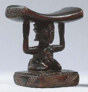 | Christie's - Amsterdam TRIBAL ART Auction Date : Sep 12, 2002 Lot 309 : A FINE LUBA SHANKADI HEADREST Description By Kiloko The support carved as a kneeling female figure with the arms raised to support the curved top, lozenge panels of keloids to the chest and abdomen, vertical double band of keloids to the forehead, incised ridged coiffure, the eyes and mouth as raised ovals with horizontal slits, diagonal cross-hatched panels about the rim of the rectangular base, hatched panels to each end of the top, dark glossy patina 14.5cm. high NOTES Cf. Pierre de Maret, Nicole Dery and Cathy Murdoch, 'The Luba Shankadi Style', in African Arts, Vol.VII, number 1, Autumn 1973, where they illustrate on the cover of the magazine a very similar headrest now in the Afrika Museum, Tervuren, by the same hand. Kiloko worked in the village of Busangu, about seventy kilometres from Kamina. Four works were acquired from him by S. Peeraer circa 1936. Estimate: $ 4,850 - $ 7,760 Price Realized: $ 11,012 |