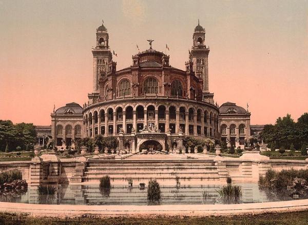 | A photo of the old Palais du Trocadéro that was built for the 1878 World's Fair. "For the Exposition Internationale of 1937, the old Palais du Trocadéro was demolished and replaced by the Palais de Chaillot which now tops the hill. It was designed in classicizing "moderne" style by architects Louis-Hippolyte Boileau, Jacques Carlu and Léon Azema. Like the old palais, the palais de Chaillot features two wings shaped to form a wide arc: indeed, these wings were build on the foundations of those of the former building. However, unlike the old palais, the wings are independent buildings and there is no central element to connect them: instead, a wide esplanade leaves an open view from the place du Trocadéro to the Eiffel Tower and beyond. The buildings are decorated with quotations by Paul Valéry, and they now house a number of museums: the Musée national de la Marine (naval museum) and the Musée de l'Homme (ethnology) in the southern (Passy) wing, the Musée national des Monuments français in the eastern (Paris) wing, from which one also enters the Théâtre national de Chaillot, a theater below the esplanade." from Wikipedia.com |