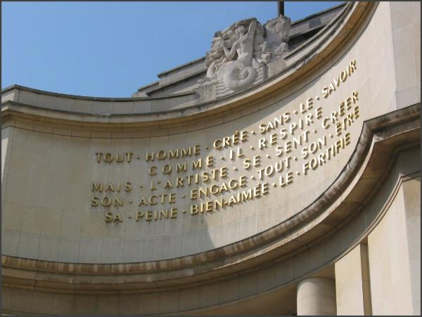 | The shots above are on the West wind of the Trocadéro which holds the Musee de l'homme. Vero read and translated the saying for us: Every man creates without knowing it Like he breathes But the artist feels himself creating His act engages his entire being His appreciated pain strengthens him |