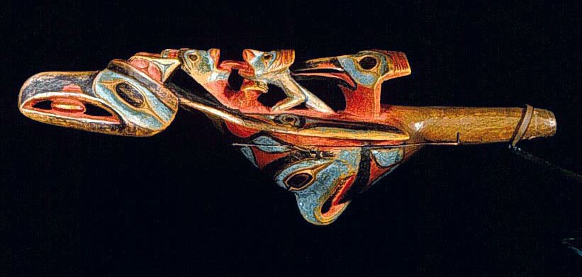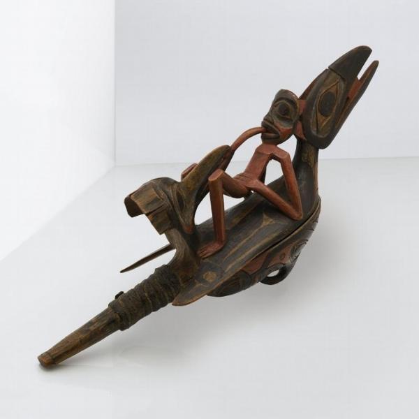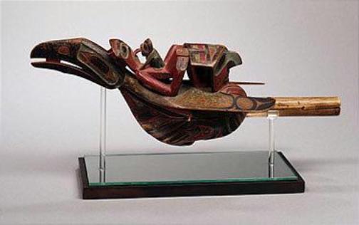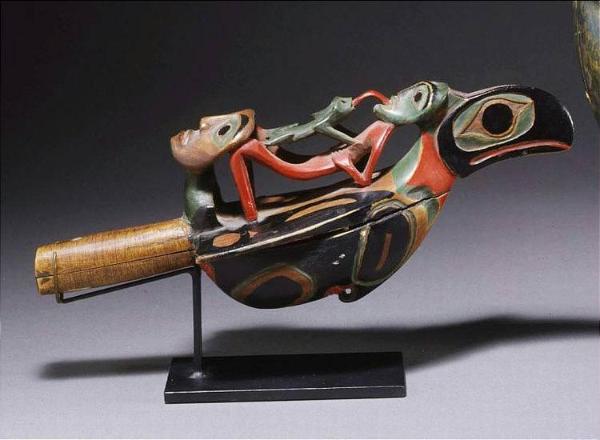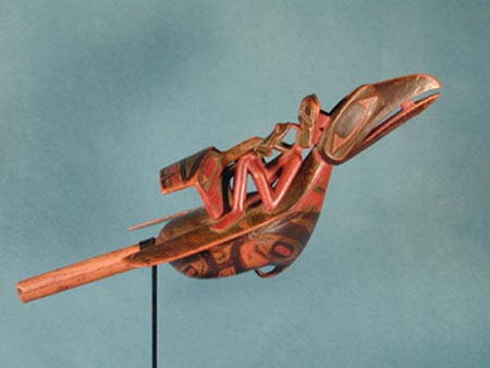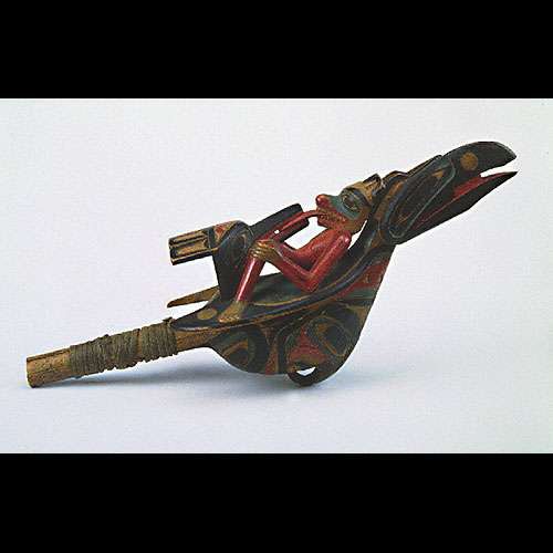 | Raven Rattle mid 1800s www.carnegiemuseums.org Raven rattles conventionally depict a complex scene in which a human reclines on the back of a raven while his tongue connects with the tongue of a frog. Meanwhile, a second bird's head, formed from the raven's tale, holds the frog. High-ranking men carried these rattles with the scene inverted as they danced ceremoniously. Maple? (Acer sp.), mineral and commercial paints, sinew, pebbles?; 3178-2 |