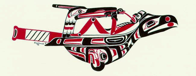 | The Rattle Raven was an important ceremonial object among North American Pacific Coast Native Americans. The Raven was a mythological hero/trickster who stole daylight from the Chief of Heaven, marking the beginning of the world, humankind, and consciousness. The reclining human/bear exchanging a tongue with a frog represented a shamanistic transfer of spiritual and healing powers." -- Description of the logo (designed by Just Imagine!) for the 4th World Congress on Pain (Seattle, Washington, 1984) [IASP United States chapter] IASP Online Archives http://www.library.ucla.edu/libraries/biomed/iasp/ |