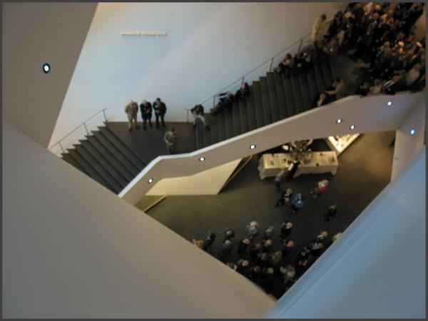 | Above is a photo (blurry) from the preview reception on September 25th looking down from the 4th floor. The inside of the museum is VERY white. |