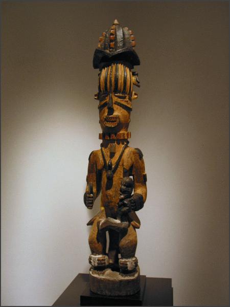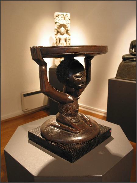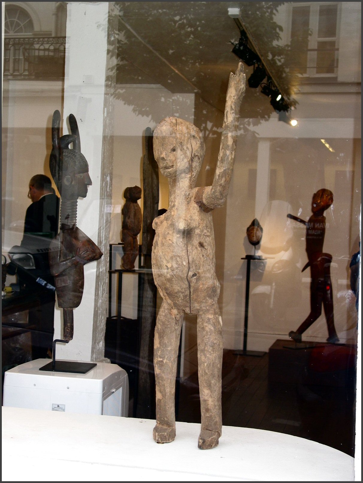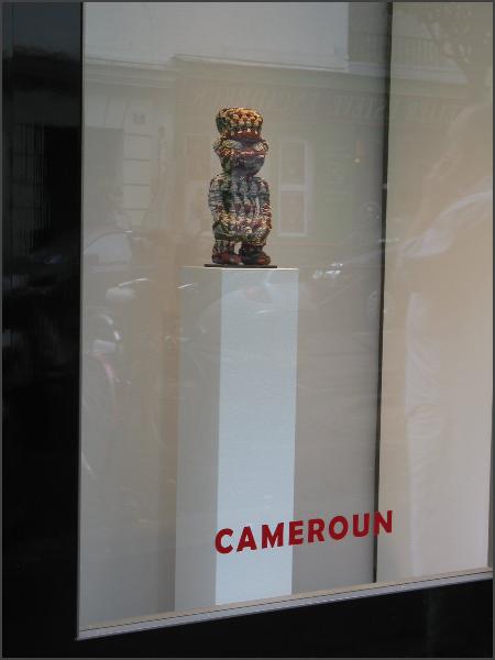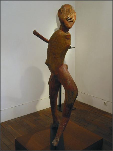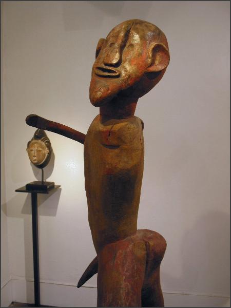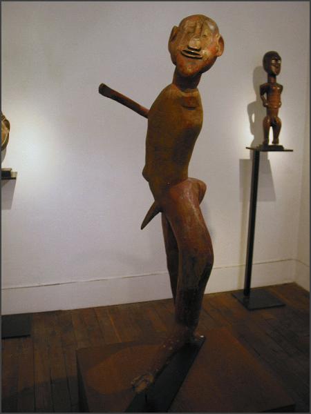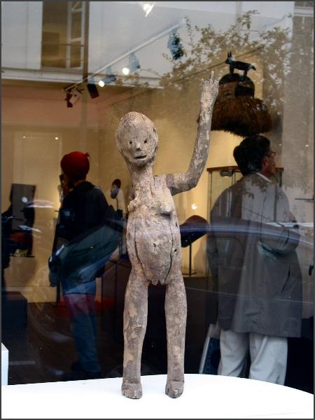 | Another gallery that I believe was part of Parcoures des mondes but wasn't in the catalog was the Oliver Klejman Gallery This gallery was one of the few that exhibited figures from Tanzania, and one of their figures got my "favorite piece of the show" designation. It was a wonderful and large figure that was identified as Sukuma. The figure was twisted and had red pigment applied, the photos I took of it really don't do it justice. I really loved the figure and I would have love to have brought it home, but at 40,000 euros I will have to just look at the photos instead. I also loved the Tanzanian figure the gallery had in their front window, check out the raised hand, it was a little figure with attitude! (grin) |