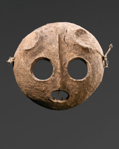 | "On the large volcanic Vokeo Island the people had masked spirits called "Lewa" that instituted prohibitions against certain garden produce that enable ritual leaders to stockpile food to be used later during important ceremonies and festivals. The Lewa came in male and female pairs with long-nose varieties like this one being considered male. The present example is one of the oldest and finest I have ever seen. The medial ridge of the forehead gracefully transforms into the long, curved nose. The patina is both glossy and thickly encrusted from generations of use. The fiber bundle lashed behind the ears and around the top of the head, has been broken, exposing traces of the orange powdered "fish magic" that originally empowered the Lewa. Like all great pieces of New Guinea art this mask is both archaic and elegant." - from the Parcours des mondes catalog |