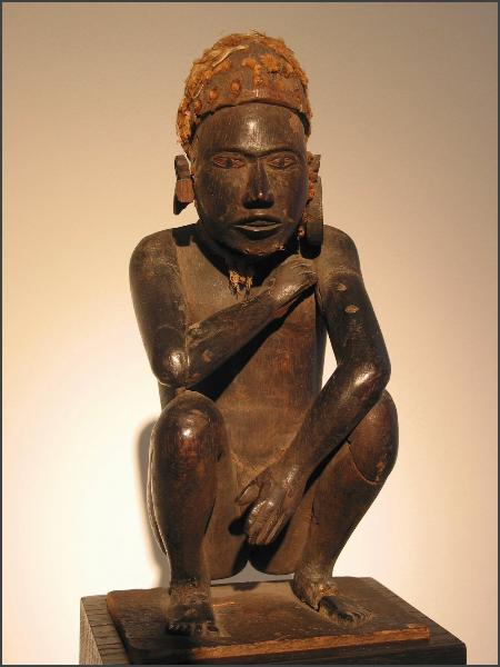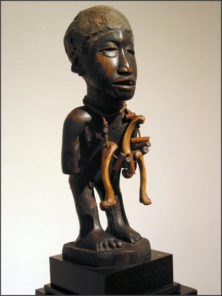 | Next was #30, Galerie Alain Lecomte (photo above was from the event catalog) "Alain Lecomte is a member of the International Organisation of Experts, Ordinex. The Gallery has been present for several years in the most important international Tribal Art Shows : New York, San Francisco, Brussels and of course, Paris. For this edition of Parcours des Mondes, there is no specific theme but rather a selection of objects exclusively from ancient collections: such as this Yoruba Habitation post representing a horse (corlay Collection), or these Yaka masks from Zaire, still with their raffia headress; this superb Dondo fetish, opposite page, is from a german collection; and a very rare Toura Mask from Walker's collection, which is a pure pleasure." This is another gallery where I didn't take a lot of photos in because I was too busy talking. Alain is a very nice guy and I really enjoy talking to him and he always has an interesting and unusual group of objects on display at the various shows he participates in. I thought I had taken a few more photos inside the gallery but I couldn't seem to locate them so I scanned the image from the catalog which is above. Alain had 4 figures like this, all similar to each other, that he got from a German collection. He said they had been collected in the early 30's and had been stored away ever since. He managed to pick up the 4 of them recently. |