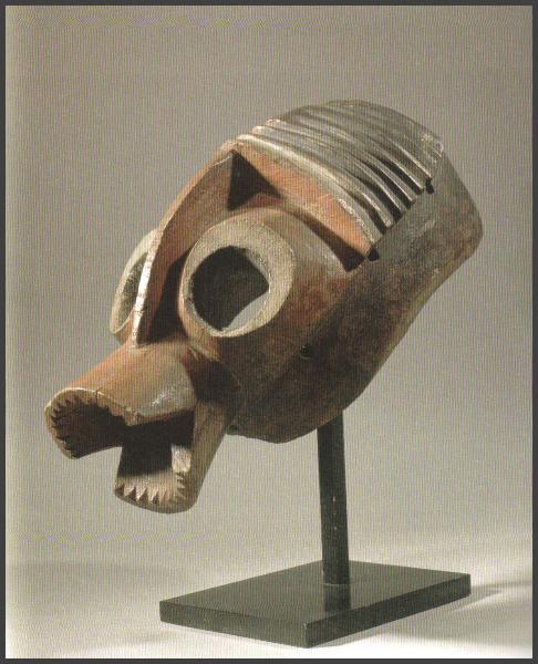 | A Tiv statue on the left and a Mumuye mask on the right that were featured in the Parcours des mondes catalog from Alain Bovis and Arte y Ritual. Photo : Manel Armengol |