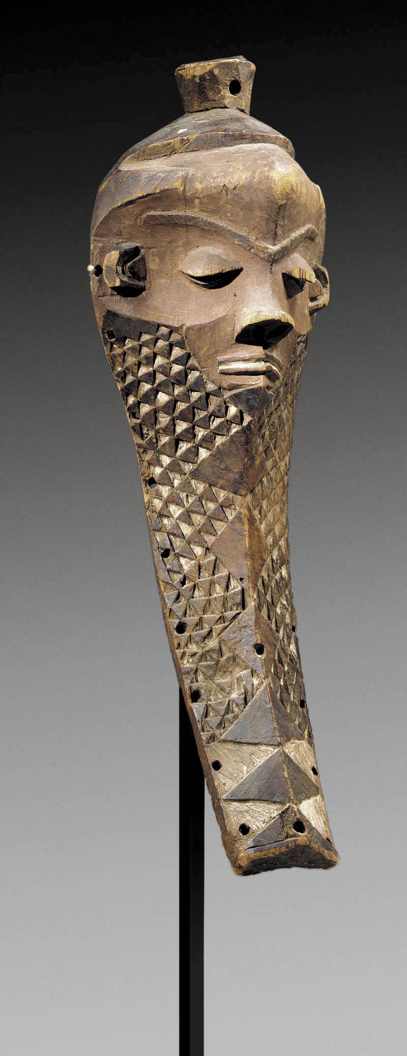 | Sotheby's - New York African and Oceanic Art Auction Date : Nov 16, 2001 Lot 137 : A rare Eastern Pende, Mombolo, Tshikapa region, mask Description A rare Eastern Pende, Mombolo, Tshikapa region, mask of hollowed angular form, the concave heart-shaped facial plane terminating in a pointed chin, with raised hollowed oval mouth, broad nose and asymmetrical pierced coffee bean eyes beneath arching browns, and covered with a repeating pierced dot motif; fine and varied encrusted red ochre patina. height 12 1/4 in. (31.1cm.) Cf. De Smet (1999: 26) for related examples of other Pende dance masks which were created as pathological masks depicting illnesses, such as this mask which portrays 'chicken-pox'. Dimensions height 12 1/4 in. (31.1 Estimate:$ 8,000 - $ 12,000 |