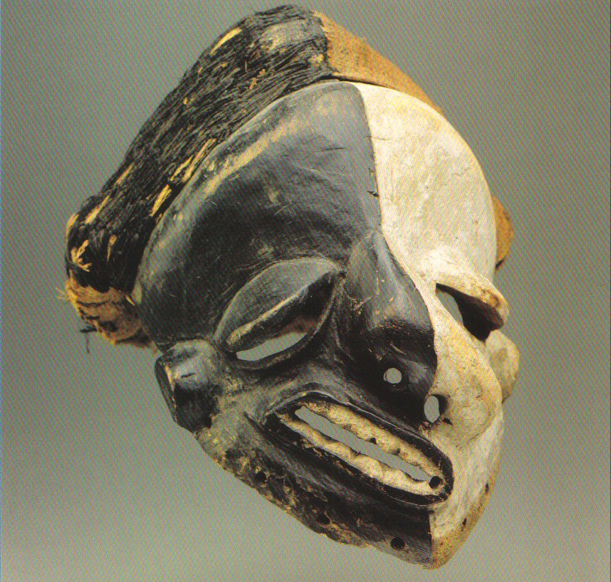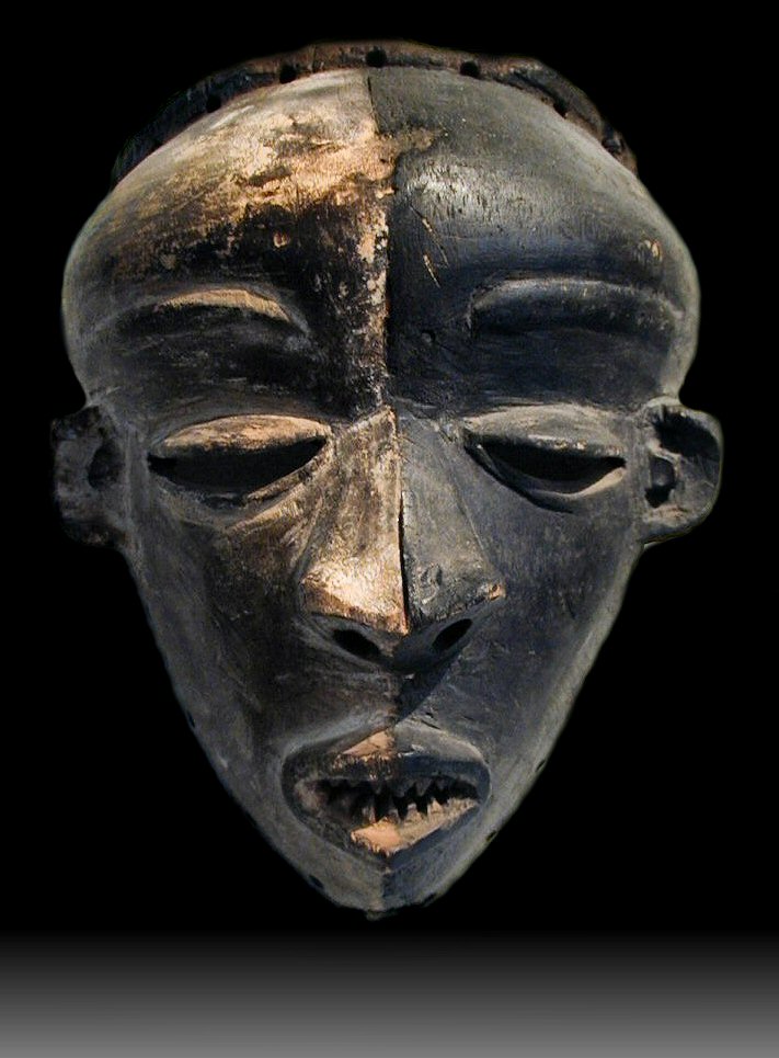 | Mbangu mask (sickness mask), Pende, Congo. The mask is recognized by an opposition of black and white that bisects the face and a general distortion of facial features specifically the twisted nose and mouth. The color white, symbolic of the spirits of the dead, in this case represents the hope of being cured of illness. The black pigment stands for the sickness and illness that ravages one throughout life. The combination of black against white symbolizes this struggle. It is very rare in Africa to find any work of art that depicts an individual strickened by sickness,infirmity or any type of disease. It is believed that disease can be brought about by an act offending spirits of ancestors and is often viewed as a punishment. Thus, many objects showing disease are used to instruct the community and to caution against destructive behavior. This is especially true of masks, which are danced to teach or remind members of the community about rules and responsibilities. A selection of Nigerian Ibibio and Congolese Pende masks underline the connection between disease and moral values. Disease is also attributed to sorcery. Sorcerers are believed to be capable of activating malevolent forces against individuals, families or the community, often in the form of physical or mental illness. Forming a sharp contrast with sculptures showing the ideal of health, other figures and masks represent a range of physical deformities caused by disease and mental imbalance. The mbangu mask is a variation on the representation of a highly regarded hunter who has been stricken with facial paralysis. It demonstrates how even the most esteemed and upright member of the community can unexpectedly be afflicted with sickness. In this case, the Pende believe that the individual is a victim of sorcery, bewitched by a rival who jealously inflicted him with disease. This mask teaches Pende audiences about the rewards of good behavior and of the pitfalls of those who are morally flawed. (Sources: To Cure and Protect) |