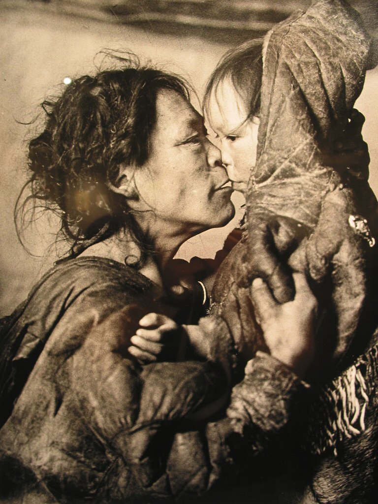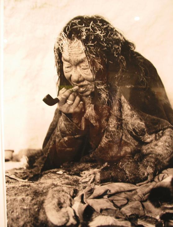 | The 2 images below are fascinating and the story behind them is even more interesting. Villages and people were effected by the change in the caribou migrations, leaving them starving and to die. Here is the story of the woman directly below: "Left alone in a cold, ice-covered igloo, Arnalukjuak sat hunched over, in threadbare clothing, her hair frosted over, saying nothing. I put some tobacco into her soapstone pipe, but she was too weak to suck on it. By next morning, she had died of cold and hunger. Her relatives sealed off the igloo." |