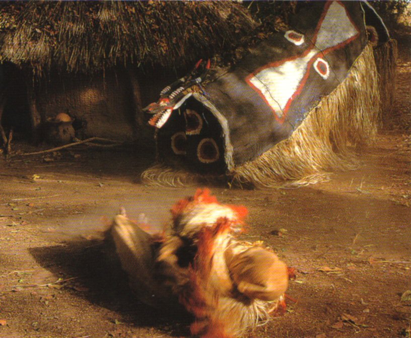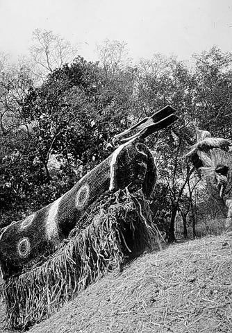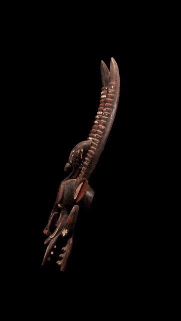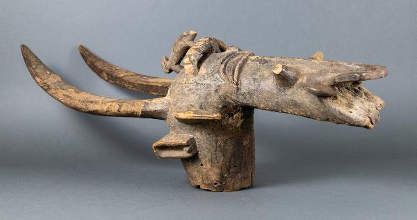 | One of the largest masks to be seen at a Senufo rituals is the Nafiq or Nasolo, which charges at terrifying speed  through the forest and into the village during rituals. Taking the form of a gigantic buffalo, with a head made up from elements of buffalo, warthog, crocodile, and antelope, the Nafiq/Nasolo symbolizes intellectual and physical perfection. Its huge body is constructed on a wooden armature covered with geometrically patterned matting. When the horned head is fixed to the front, the mask measures more than six feet in height and can be up to fifteen feet in length. Concealed within the mask, two Poro society members articulate its enormous structure. One of them operates a resonating instrument that produces the creature's characteristic roaring and acts as a warning for the uninitiated to keep out of its way. The Nafiq/Nasolo is always accompanied by two acrobat-guardians who guide it through its maneuvers and keep away non-initiates. Dressed from head to toe in tightly woven mesh suits fringed with raffia, the ritual guardians dance agilely round the Nafiq/Nasolo. Goading and taunting the enormous mask, they lie down in front of him, waiting until the last second before jumping up to escape his ravenous jaws.  |