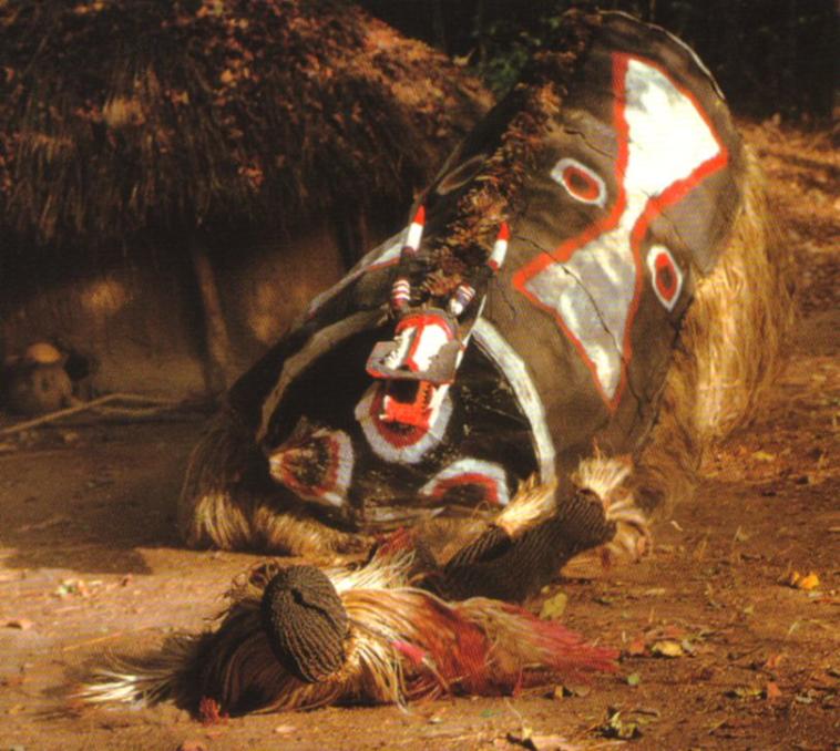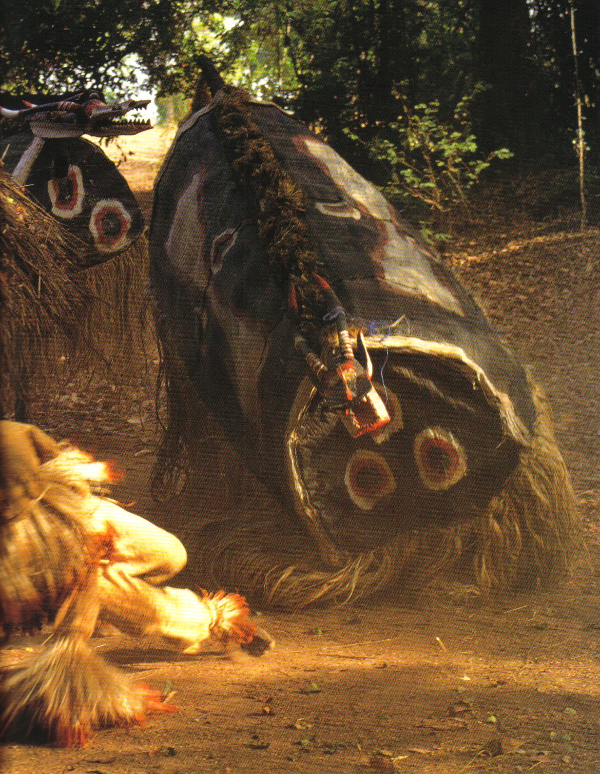 | Information below from the book “The Dance, Art, and Ritual of Africa” by Michel Huet. Description- “Kagba ritual in which the giant ox Nasolo (literally ‘elephant-ox’) is presented to the neophytes. This unique being, Nasolo, moves around the periphery of the central Sinzanga accompanied by a guide- interpreter, Kodalu, who is completely covered by a cotton garment. They appear to be moving rather at random, but in fact Nasolo moves with great precision from one demarcated plot to the other, all along the sacred grove. Nasolo consists of a light wooden cylindrical frame covered with braid and decorated with geometrical patterns in many different colors. Kagba means, in fact, ‘many colored’. In front is a sculptural head combining antelope and crocodile motifs, and sometimes elements of man. At the back is a tail of plaited raffia. The whole structure is often well over a meter in height and as much as 5 meters in length. It is maneuvered by two men hidden inside. Sometimes one of the bearers manipulates a sort of rubbing device that emits a sound resembling a lion’s roar. For the neophytes, although the elements are not homogeneous and do not recall any specific creature, Nasolo represents a buffalo, a symbol of intellectual and physical perfection.”  |